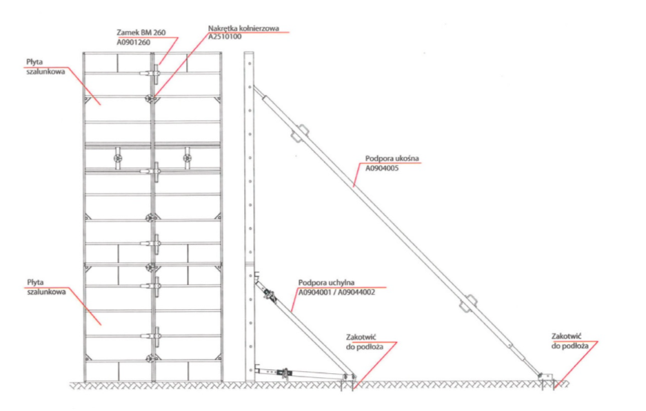 Pamiętajmy również o podporach uchylnych dokręcanych do specjalnych otworów w szalunkach oraz kotwionych do podłoża w celu wypionowania całej konstrukcji. W fazie zalewania betonem powinniśmy zwrócić szczególną uwagę, aby nie przekroczyć dynamiki/tempa wprowadzania betonu między ściany, gdyż parcie może okazać się zbyt duże. Tego typu zaniedbanie może doprowadzić do przekroczenia granicy wytrzymałości nakrętek zabezpieczających ściągi łączące ściany szalunkowe.