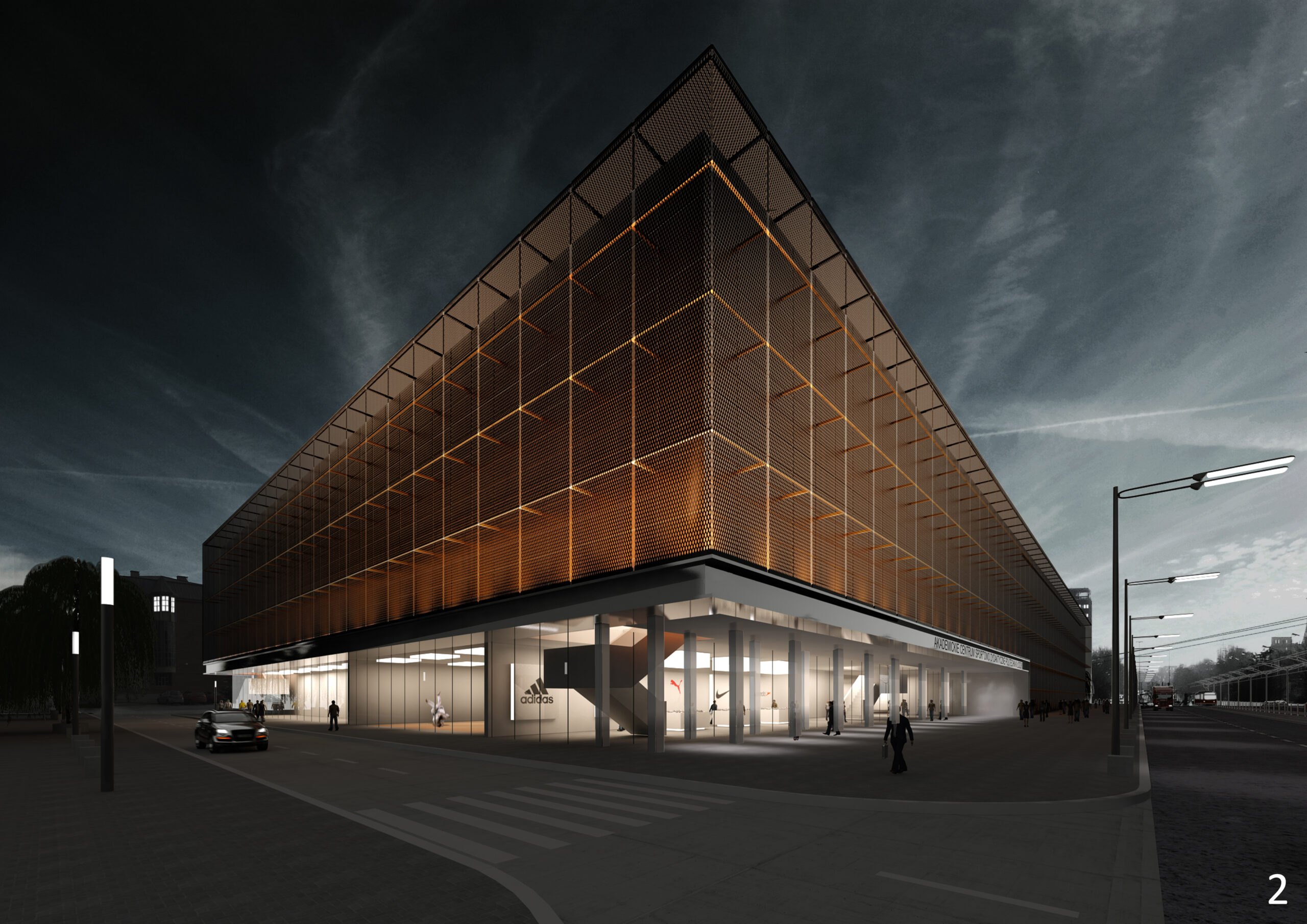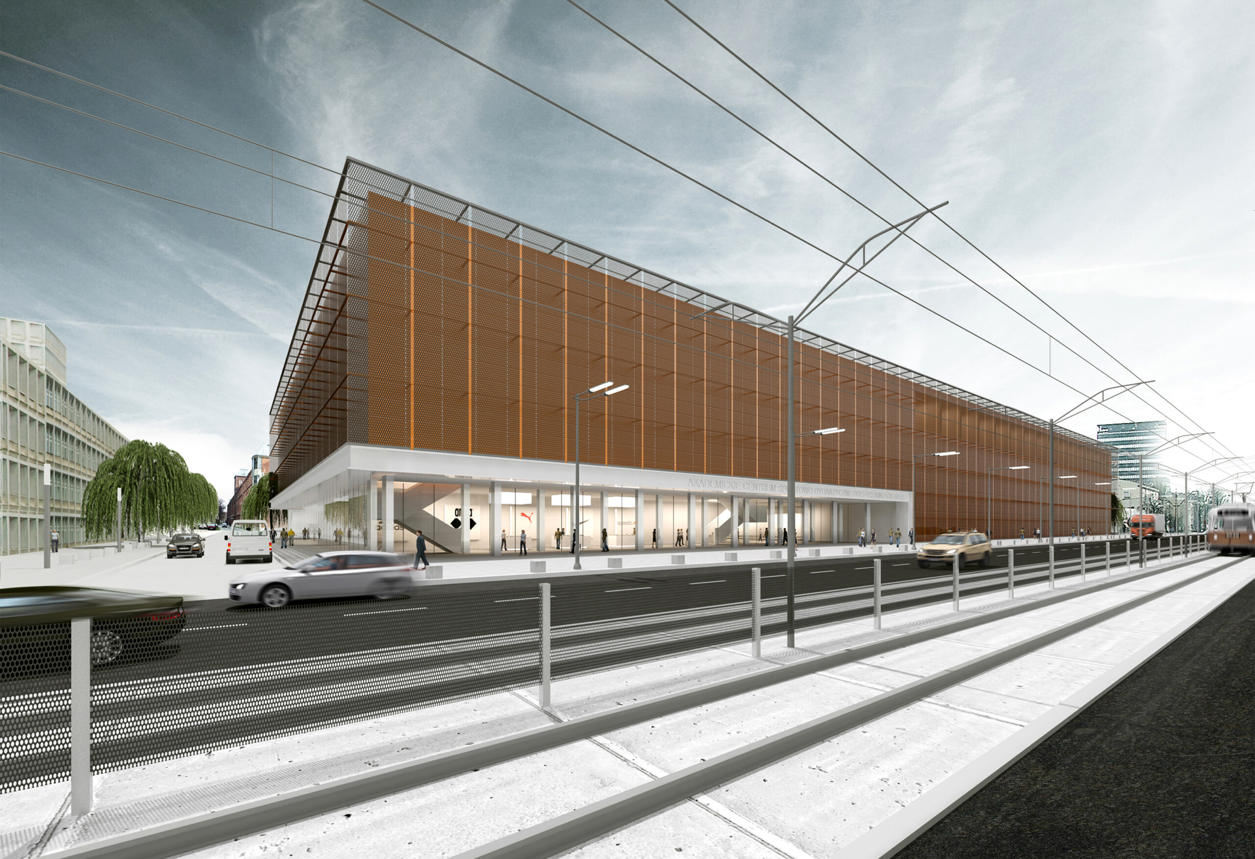 W nawiązaniu do ceglanej, pofabrycznej architektury obiektów łódzkich zastosowaliśmy rozwiązanie o podobnej wyrazistości i stylistyce. Bazę stanowią tu barwa, prostokreślne płaszczyzny oraz „wielowarstwowość”. Różnorodne pod względem technologicznym wnętrze „wybija się” na zewnątrz, organizując zarówno elewacje, jak i zewnętrzną przestrzeń publiczną. „Piętno techniczne” w postaci doświetleń, czerpni powietrza, fos technicznych itp., pojawiające się na wszystkich elewacjach, zdecydowaliśmy się okiełznać, wprowadzając zewnętrzną kurtynę z siatki stalowej. Tworzy ona wrażenie mgiełki unoszącej się wokół budynku, rozmywającej kontury elementów technicznych, którym z tak ograniczonej przestrzeni wewnętrznej pozostają „wyjścia” na zewnątrz w najmniej pożądanych przez projektanta miejscach. Ażurowy woal zapewni widzowi wrażenie spójności, a światło i różnorodne faktury elementów tworzących właściwą elewację będą pulsować zgodnie z życiem obiektu.