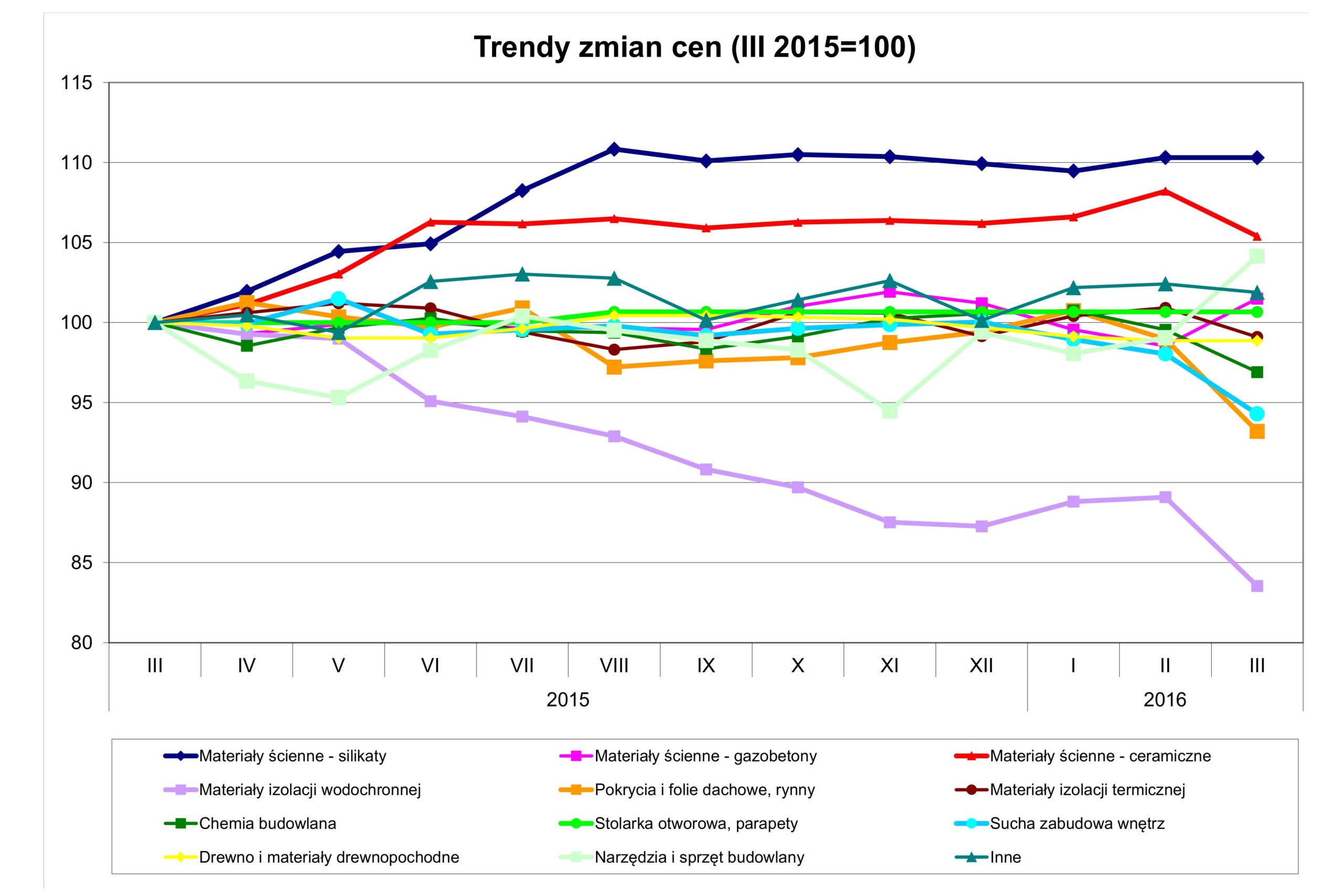 W marcu 2016 r. w porównaniu do poprzedniego miesiąca wzrosły ceny narzędzi i sprzętu budowlanego (+5,1%) oraz gazobetonów (+3%). Ceny spadły w 6 grupach: izolacja wodochronna (-6,2%), pokrycia i folie dachowe, rynny (-5,8%), sucha zabudowa (-3,8%), chemia budowlana (-2,7%), materiały ścienne ceramiczne (-2,6%) oraz izolacje termiczne (-1,8%). W innych grupach ceny nie zmieniły się.