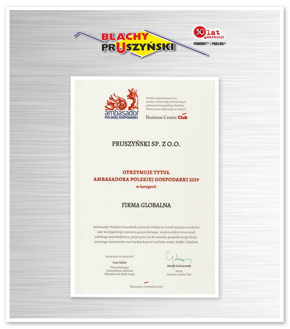 Konkurs przeprowadzony przez Business Centre Club miał na celu wyłonić przedsiębiorców zaangażowanych w gospodarkę międzynarodową i promujących polskie produkty poza granicami kraju. Firma Blachy Pruszyński została wyróżniona w tegorocznym zestawieniu dzięki rosnącemu eksportowi pokryć/przekryć dachowych i elewacyjnych. Prezes przedsiębiorstwa – Krzysztof Pruszyński – stawia na ciągły rozwój, dlatego angażuje się w coraz to większe i dalsze projekty. Aktualnie około 25% przychodów firmy pochodzi z eksportu. Jej spółki znajdują się w takich miejscach jak Ukraina, Węgry, Rumunia i Czechy. Swoich sił próbuje również na rynkach Zachodnich – Francja, Niemcy oraz kraje skandynawskie. Zdarzają się także dalsze wyprawy w kierunku Afryki czy Ameryki Południowej, gdzie przesyłane są raczej gotowe konstrukcje dostarczane w modułach. Jest to na razie mała część działalności firmy, jednak zapowiada się jako obiecujący początek. Wyróżnienie tytułem Ambasadora Polskiej Gospodarki jest dużym osiągnięciem i powodem do dumy dla zarządu oraz dla pracowników Blachy Pruszyński – skutecznie motywuje do działania.