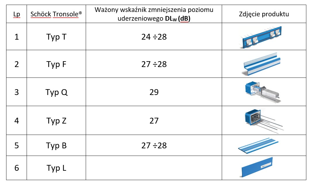 W tabeli 1 zestawiono typy elementów systemu Schöck Tronsole® z ich parametrami akustycznymi (wg Aprobaty Technicznej ITB AT156961/2015 ; tabl.7)