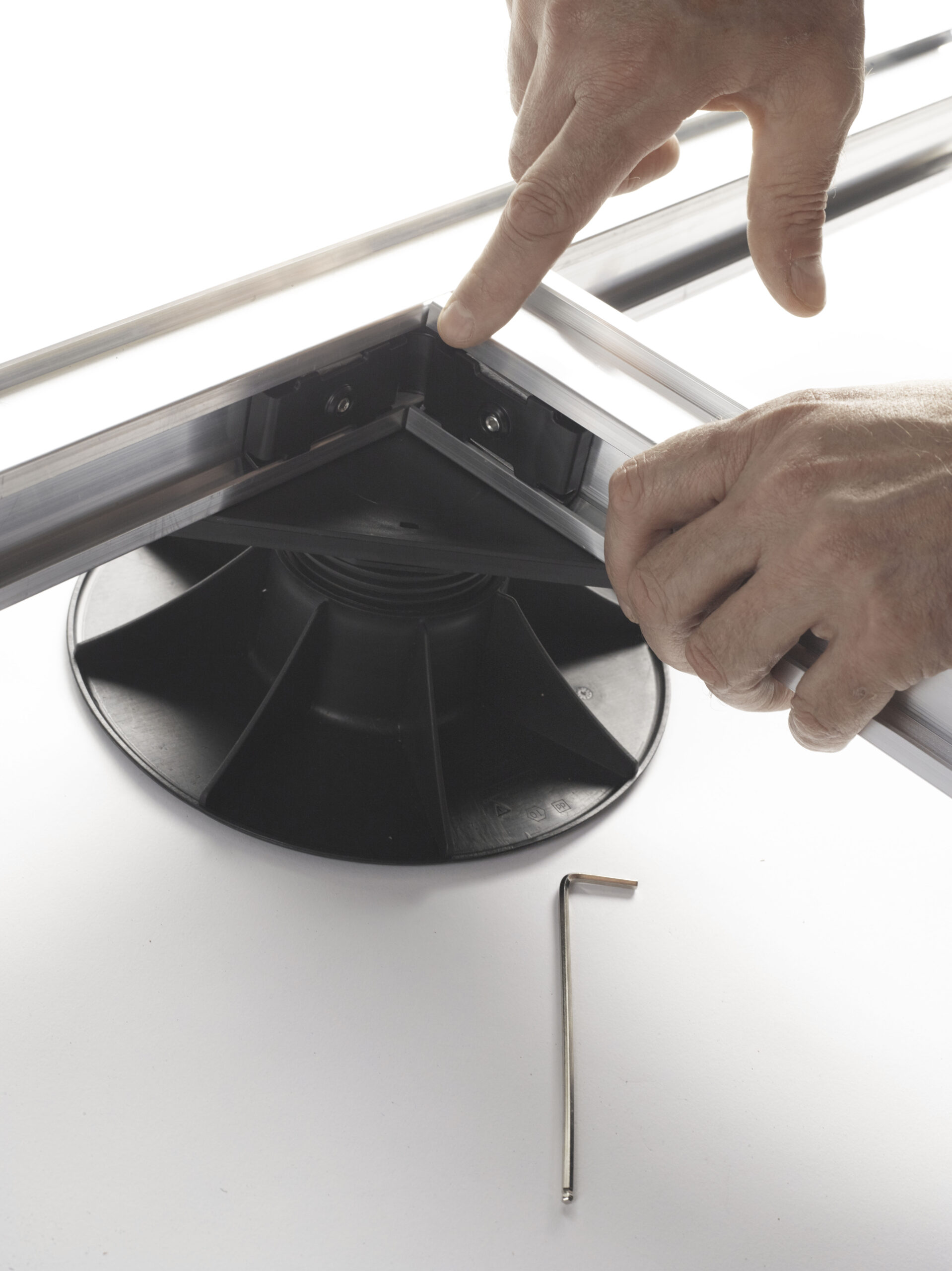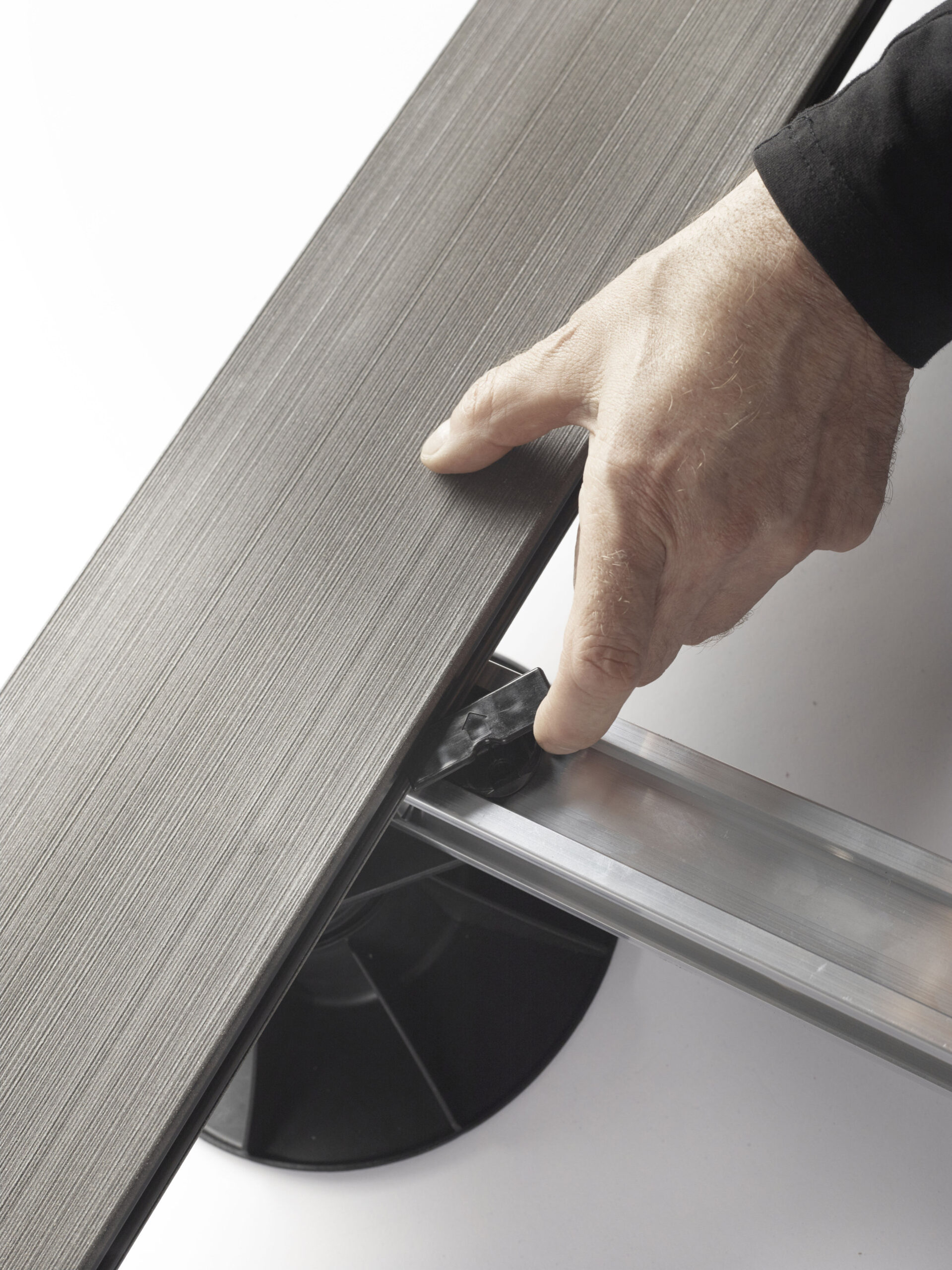 Twinson Click to aluminiowa konstrukcja składająca się z zestawu modułowych elementów, które umożliwiają instalację tarasu o dowolnym kształcie i rozmiarze. Nierówności lub różnice wysokości można łatwo wyeliminować. Za pomocą jednego kliknięcia trójkątna podstawa Triax umożliwia mocowanie do legara pod różnymi kątami. Instalując tarasy dachowe, monterzy mogą użyć dodatkowej gumowej podkładki, aby chronić pokrycie dachu; może być ona również stosowana do wyrównania minimalnych różnic poziomów w klasycznych tarasach. W skład systemu Twinson Click wchodzą także wsporniki i przedłużki, które można dostosować do dowolnej wysokości tarasu – od 45 mm do 225 mm. Lekkie profile aluminiowe z czterema identycznymi bokami są intuicyjne w użyciu i łatwe do skrócenia czy cięcia pod kątem. Gwarantują długą żywotność tarasu. A dzięki zaledwie trzem elementom całą strukturę tarasu można zmontować bez użycia śrub – to trzy klipsy montażowe, które za pomocą kliknięć mocują poszczególne elementy tarasu.
