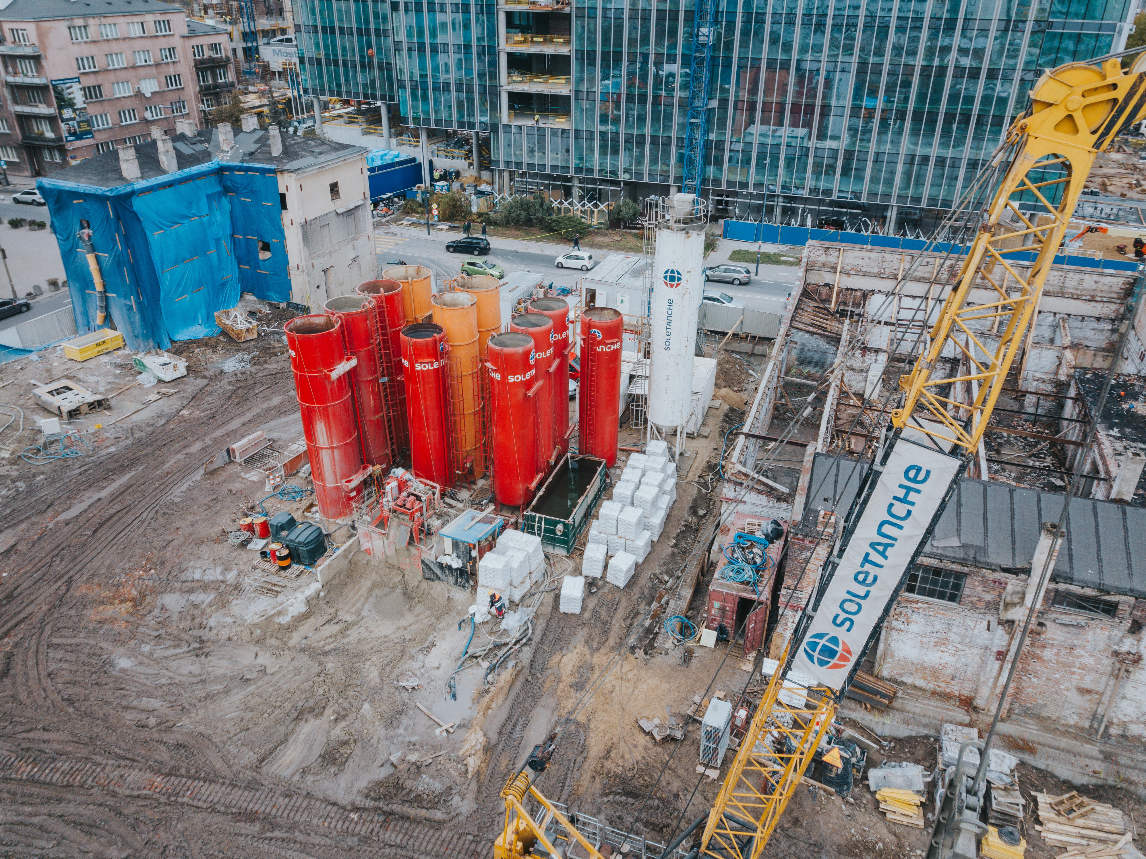 Pierwszym etapem prac było zabezpieczenie zabytkowych fasad za pomocą kolumn wykonanych w technologii jet – grouting. Tutaj ogromnym wyzwaniem była ograniczona skrajnia jak i ciasne prześwity między budynkami, które powodowały, że realizacja kolumn wymagała czasu i ogromnej precyzji. W sumie Soletanche wykonało 1423 kolumn (977 jako podbicie fundamentów oraz zabezpieczenie wykopów i 446 jako wzmocnienie gruntu) – wyjaśnia Michał Kurzeja, Kierownik Robót Soletanche Polska.