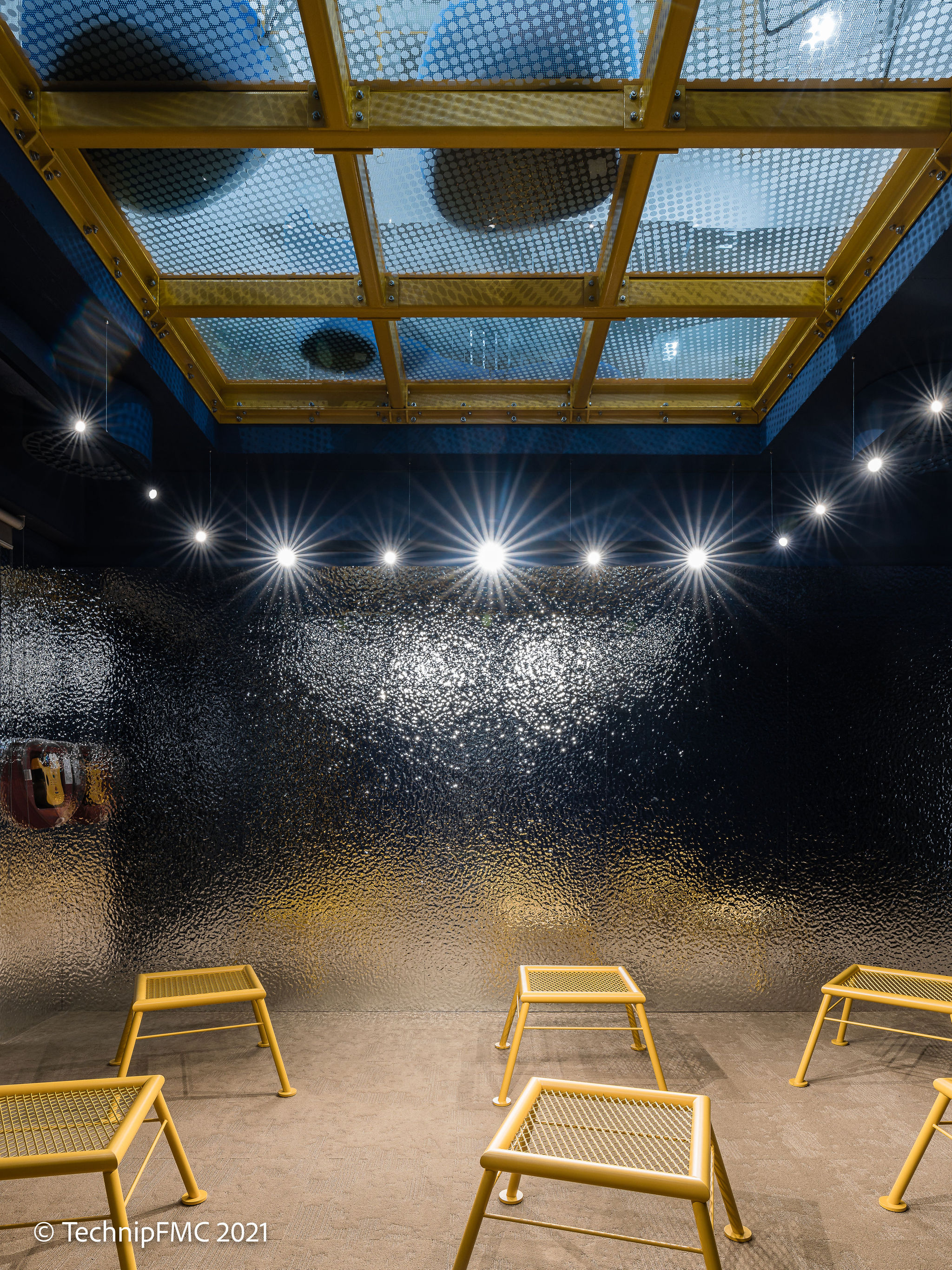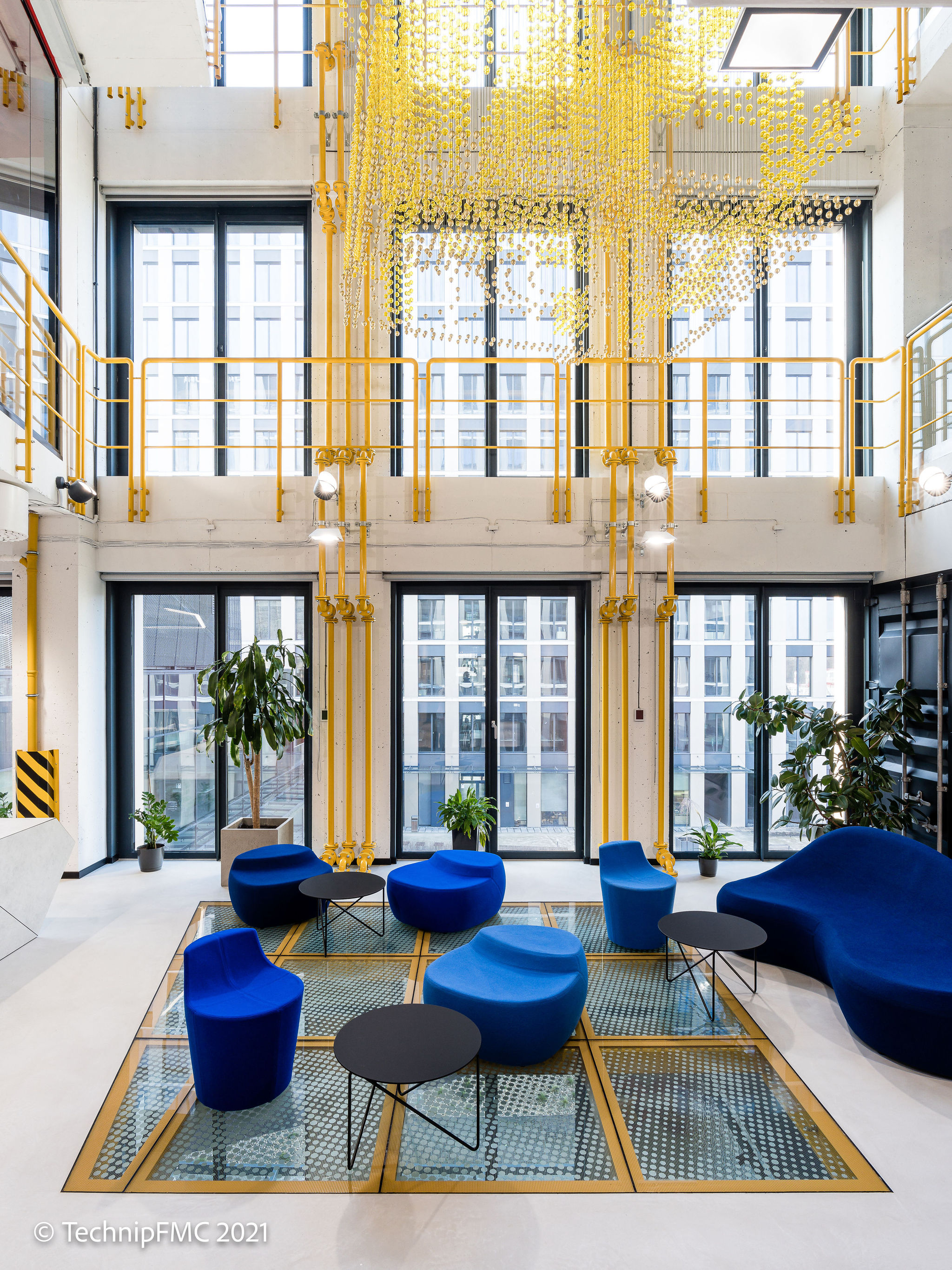 Udało się stworzyć przestrzeń oddającą klimat podwodnej głębi i morskich klimatów. Jest tu technicznie i surowo. Najbardziej widocznym elementem jest odtworzenie klimatu sprzętu pływającego TechnipFMC – odkryte instalacje i okablowanie, przemysłowe lampy, kratownice, kontenery oraz żółte barierki techniczne. Jest także orurowanie ciągnące się po wewnętrznej elewacji budynku w strefie void, od piętra drugiego aż po czwarte. Innym ciekawym rozwiązaniem jest pokrycie ścian malowaną blachą trapezową, czy rozpięcie siatek cięto-ciągnionych na sufitach. W przestrzeni krakowskiego biura swoje miejsce znalazły także prawdziwe drzwi kontenerowe z odzysku. Autorami projektu wnętrza jest pracownia projektowa The Design Group oraz zespół projektowy TechnipFMC.