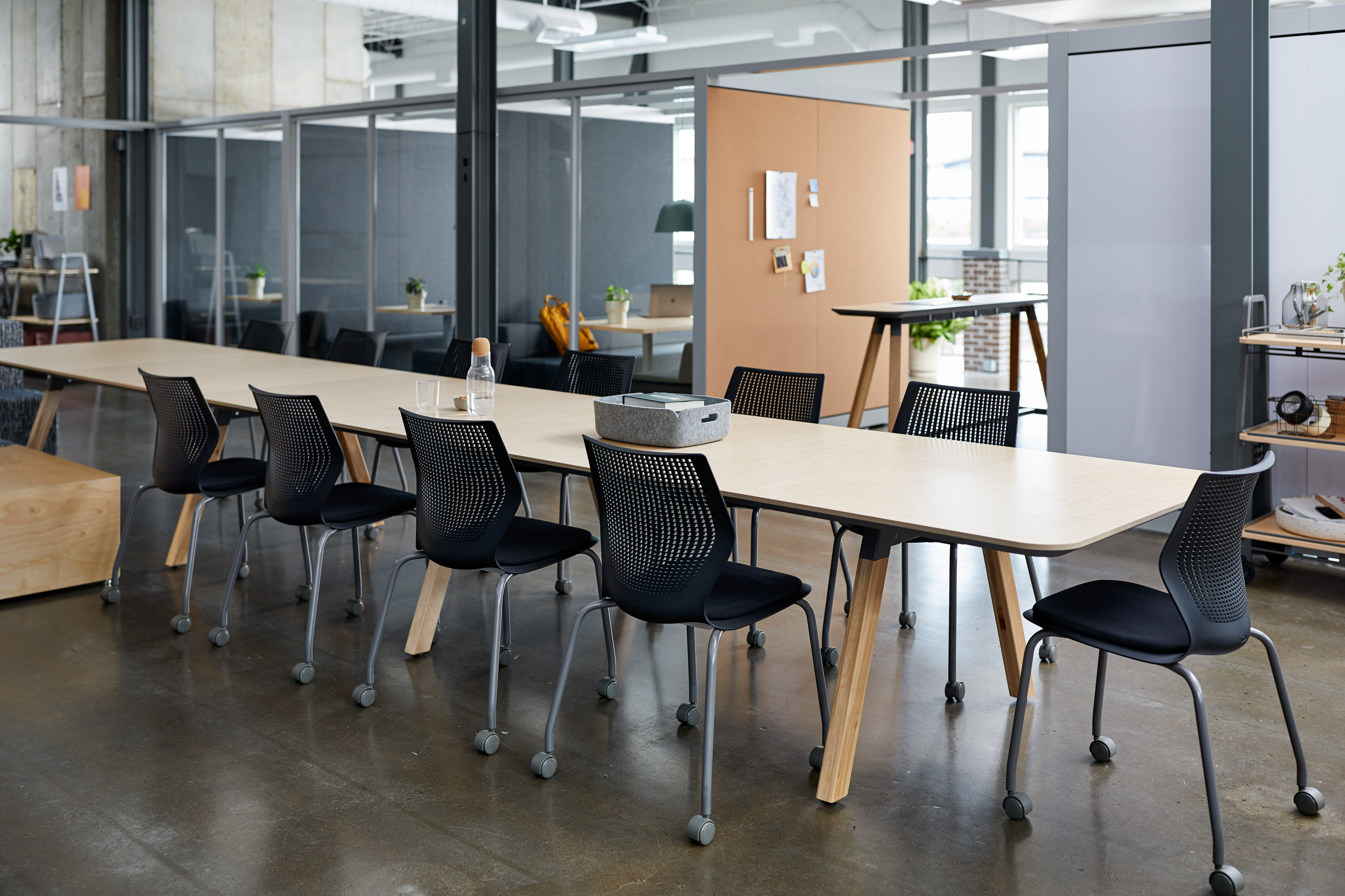 W nowo zaprojektowanych przestrzeniach do pracy dobrze sprawdzą się mniejsze gabarytowo, stoły trapezoidalne albo okrągłe, takie jak np. system modułowy stołów KEI od Bulo, MAX od Wilkhahna albo stoły firmy BLOG. Można przy nich łatwiej posadzić większą ilość uczestników przed kamerą, a także łatwiej nimi zarządzać. Stół Rockwell Unscripted® Sawhorse z Knolla pomaga dopasować pomieszczenie/przestrzeń do różnych potrzeb, jakie pojawiają się podczas współpracy cyfralnej (cyfrowej + realnej). Innym elastycznym meblem, ułatwiającym pracę hybrydową jest Scope Team Table od Knolla. To jeden mebel, przy którym ludzie mogą pracować jako zespół (w opcji stołu konferencyjnego) albo indywidualnie. Stół można w każdej chwili podzielić na odrębne hot deski wykorzystując do tego specjalnie zaprojektowane ekrany Universal.