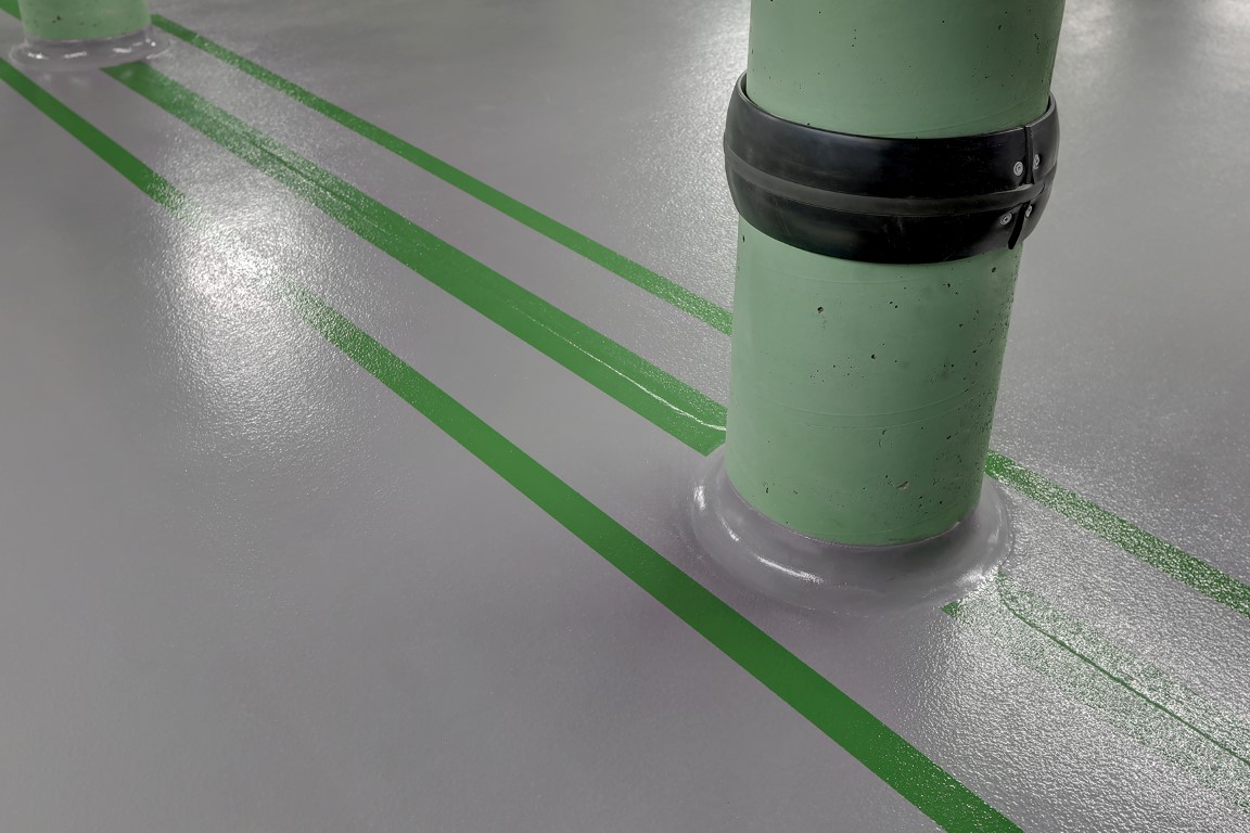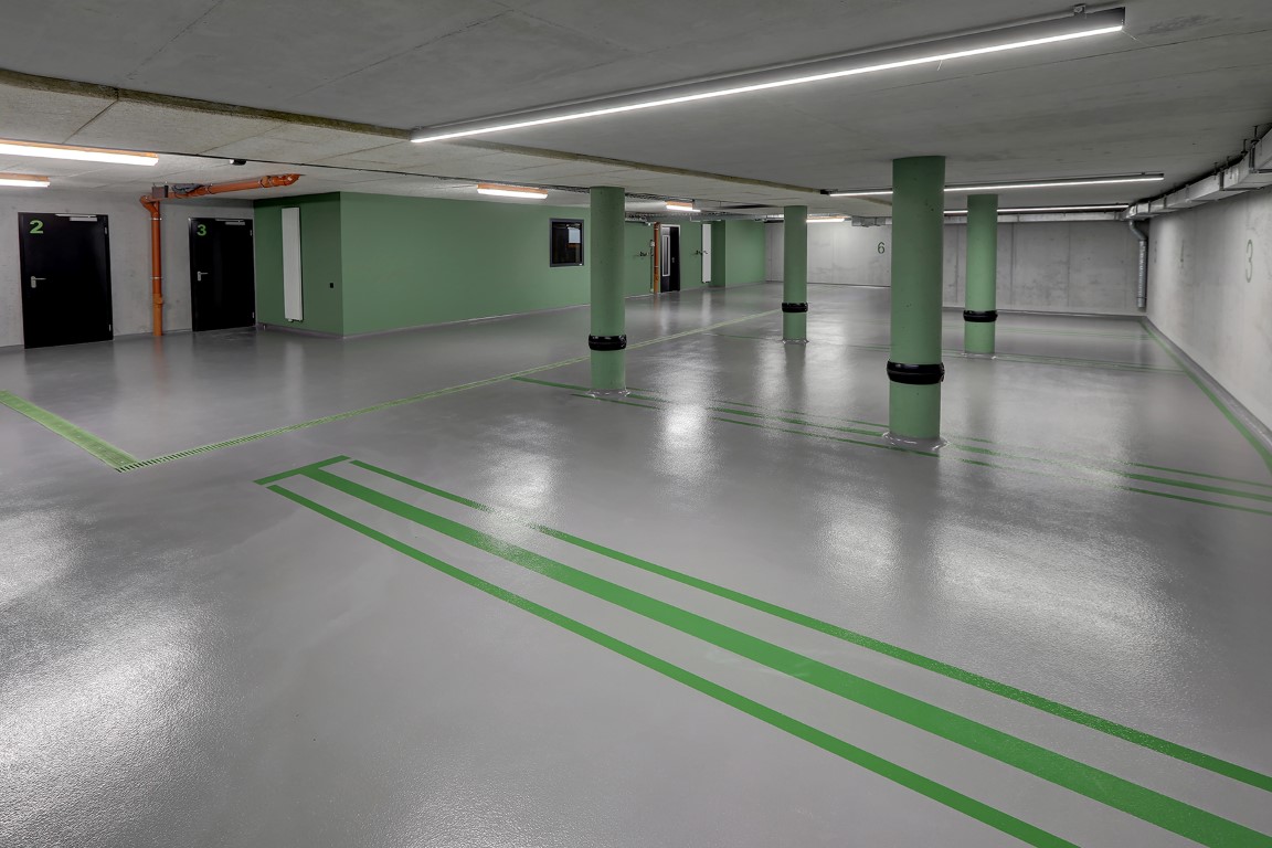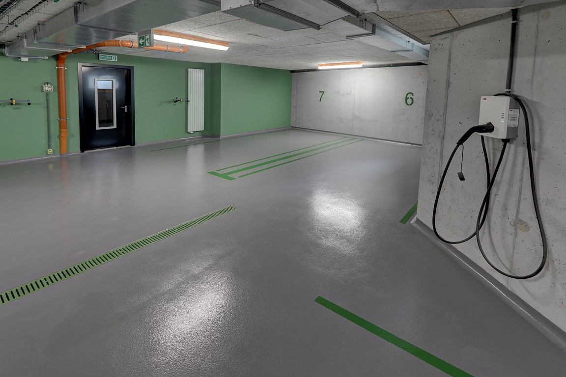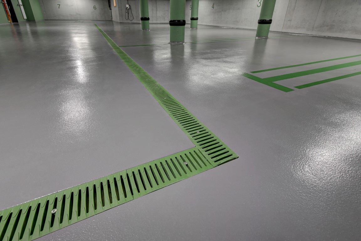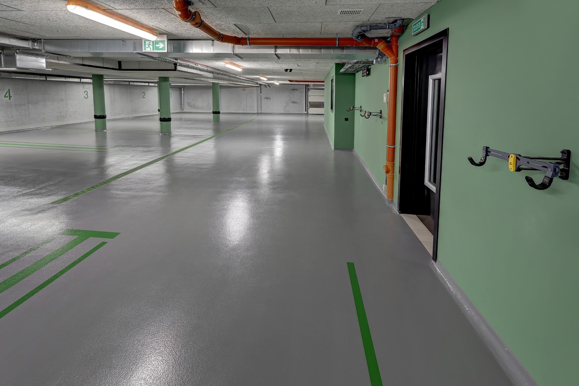 Na parkingu Rezydencji na Wzgórzu, na łącznej powierzchni ponad 260 m2, wykonano żywiczne posadzki Deckshield, w szarym kolorze, z oznaczeniami poziomymi w odcieniu zieleni, dopasowanym do barwy ścian i elementów odwodnienia.