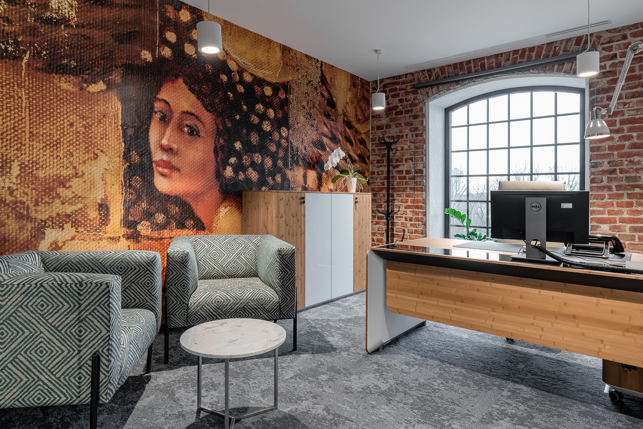 Wnętrza polskiego oddziału biura firmy Clariant łączą w sobie styl industrialny, nutę elegancji, ale także góralską, szwajcarską nutę. Architekci z The Design Group postawili na integrację współczesnej architektury z historią Monopolu, DNA firmy Clariant i najnowocześniejszymi rozwiązaniami technologicznymi. W ponad stuletnim budynku znajduje się mnóstwo ceglanych ścian, które zostały wyeksponowane i zaaranżowane na motyw przewodni – sztuka bliżej ludzi, zaprezentowany na 79 wielkoformatowych bezszwowych fototapetach. Każda z nich nawiązuje do jednej z sześciu głównych wartości firmy. Pomysły na nadruki przedstawione przez Clariant zostały przetestowane pod względem estetyki i integracji ze strukturą budynku. Z kolei charakterystyczna duża wspólna kuchnia nawiązuje bezpośrednio do szwajcarskiego klimatu i alpejskich chat.