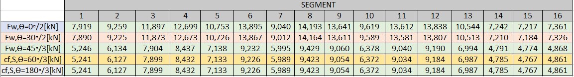 Rys. 2. Obciążenia wiatrem oblodzonej wieży nr 2 (od lewej: wiatr 0, 30, 45, 60, 180), wartości obciążeń podane w tabeli.