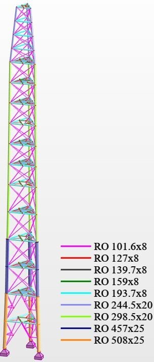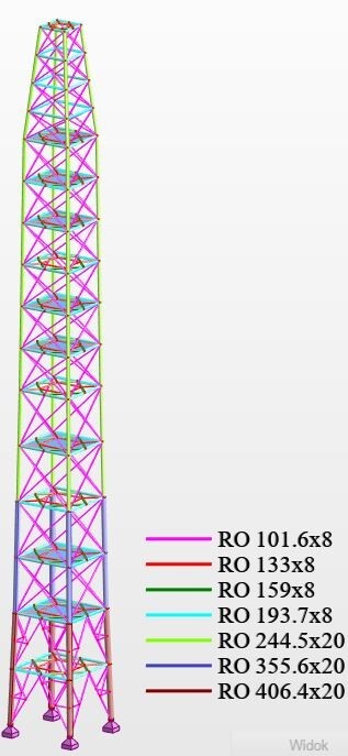 Zapisano łącznie 39 kombinacji obciążeń, korzystając z norm PN-EN 1990:2004 [5] oraz [1], w tym 22 kombinacje SGN oraz 17 kombinacji SGU. W programie Robot zostały ustalone definicje poszczególnych prętów konstrukcji i przeprowadzono wstępne wymiarowanie przekrojów. W obliczeniach uwzględniono efekty II rzędu poprzez ustawienie statyki P-Delta w programie Robot. Przeprowadzona została również analiza modalna z uwzględnieniem sił statycznych w celu sprawdzenia wartości częstości drgań własnych wież.