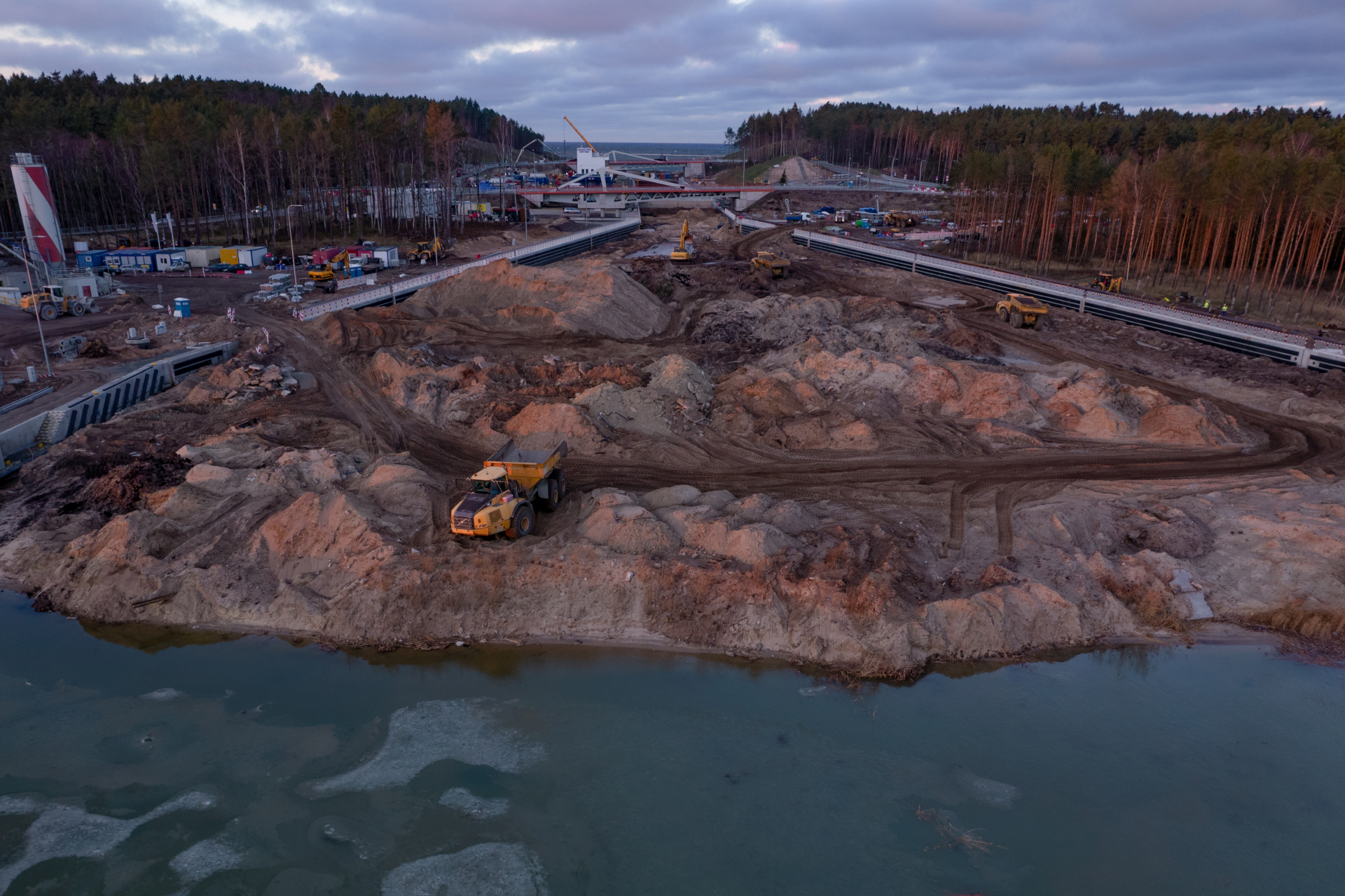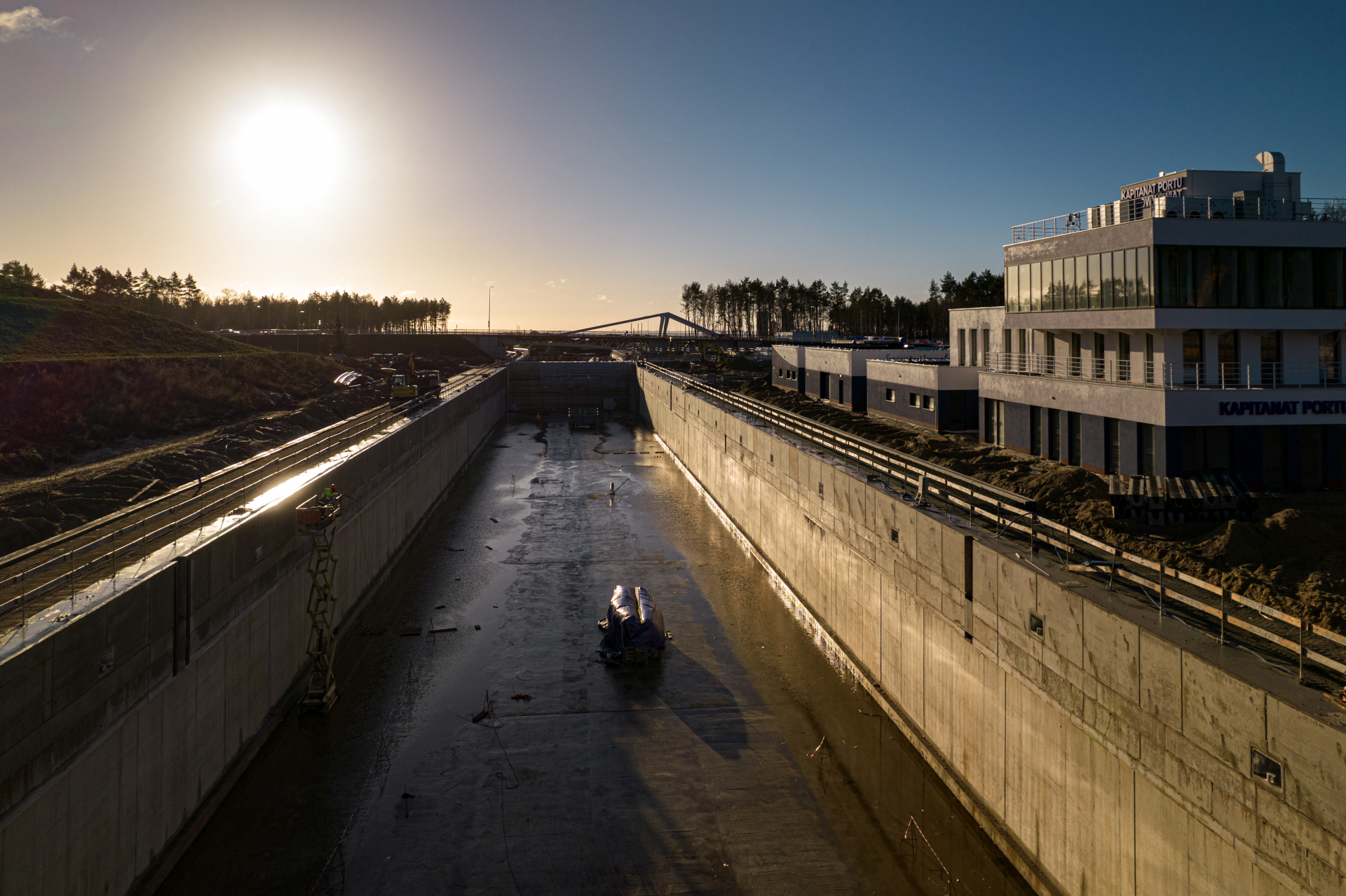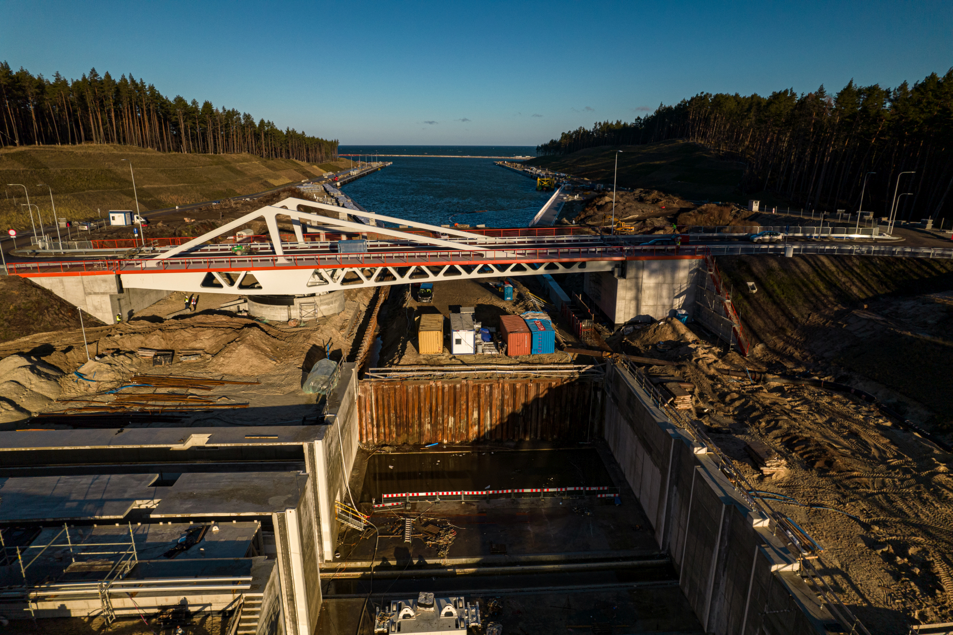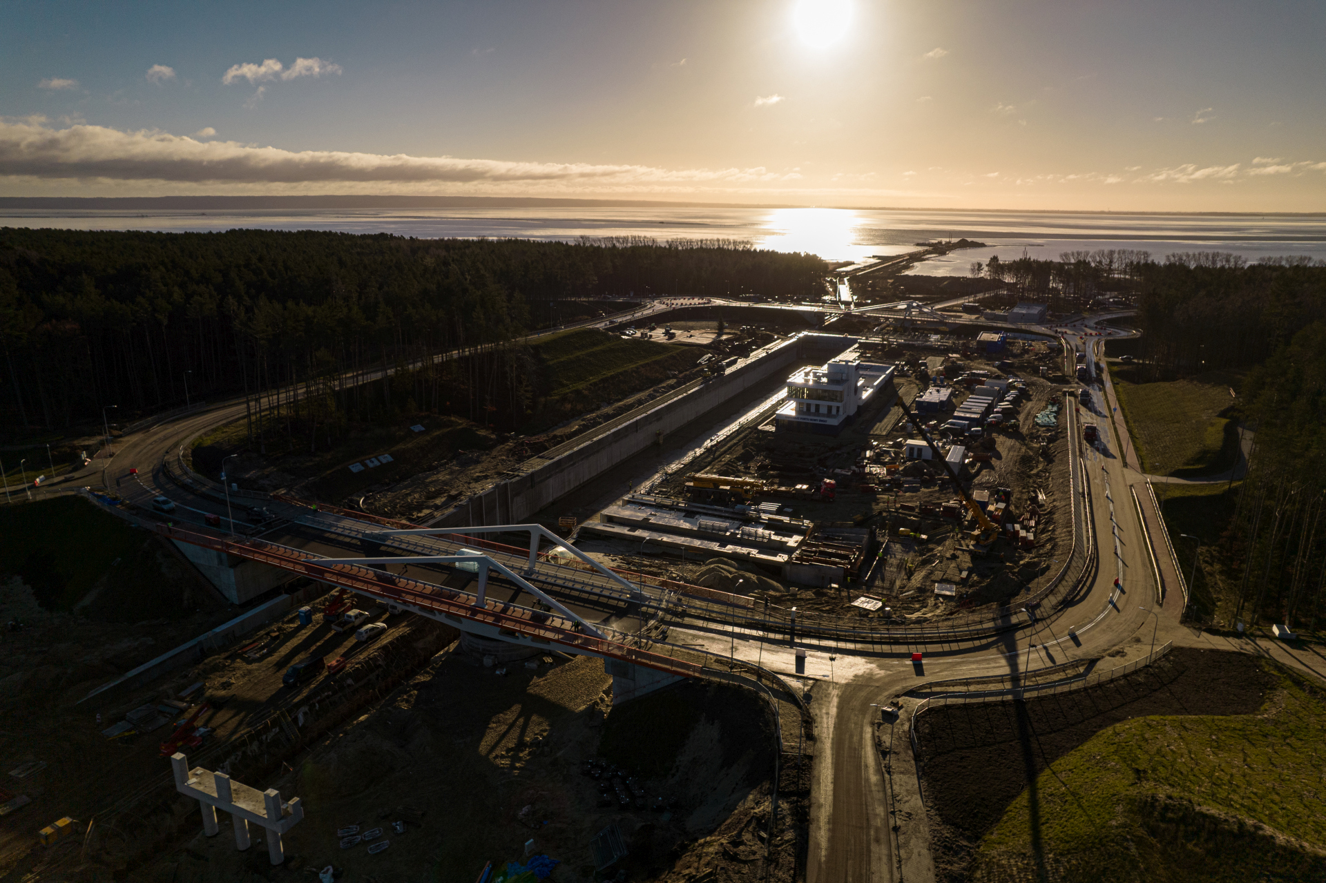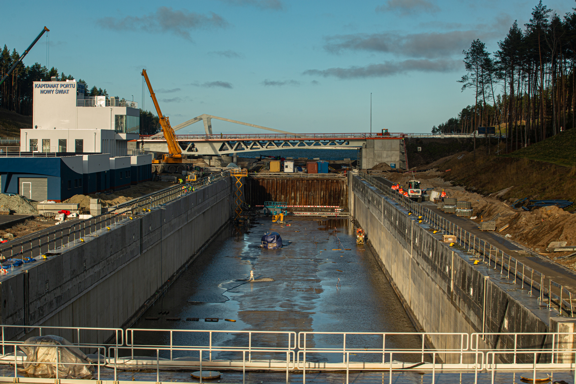Postęp prac jest widoczny również m.in. w rejonie śluzy i kanału żeglugowego, czyli w miejscach newralgicznych dla tej inwestycji. Śluza zapewnia bowiem bezpieczną żeglugę w warunkach zmiennych stanów wody po obu stronach Mierzei Wiślanej.