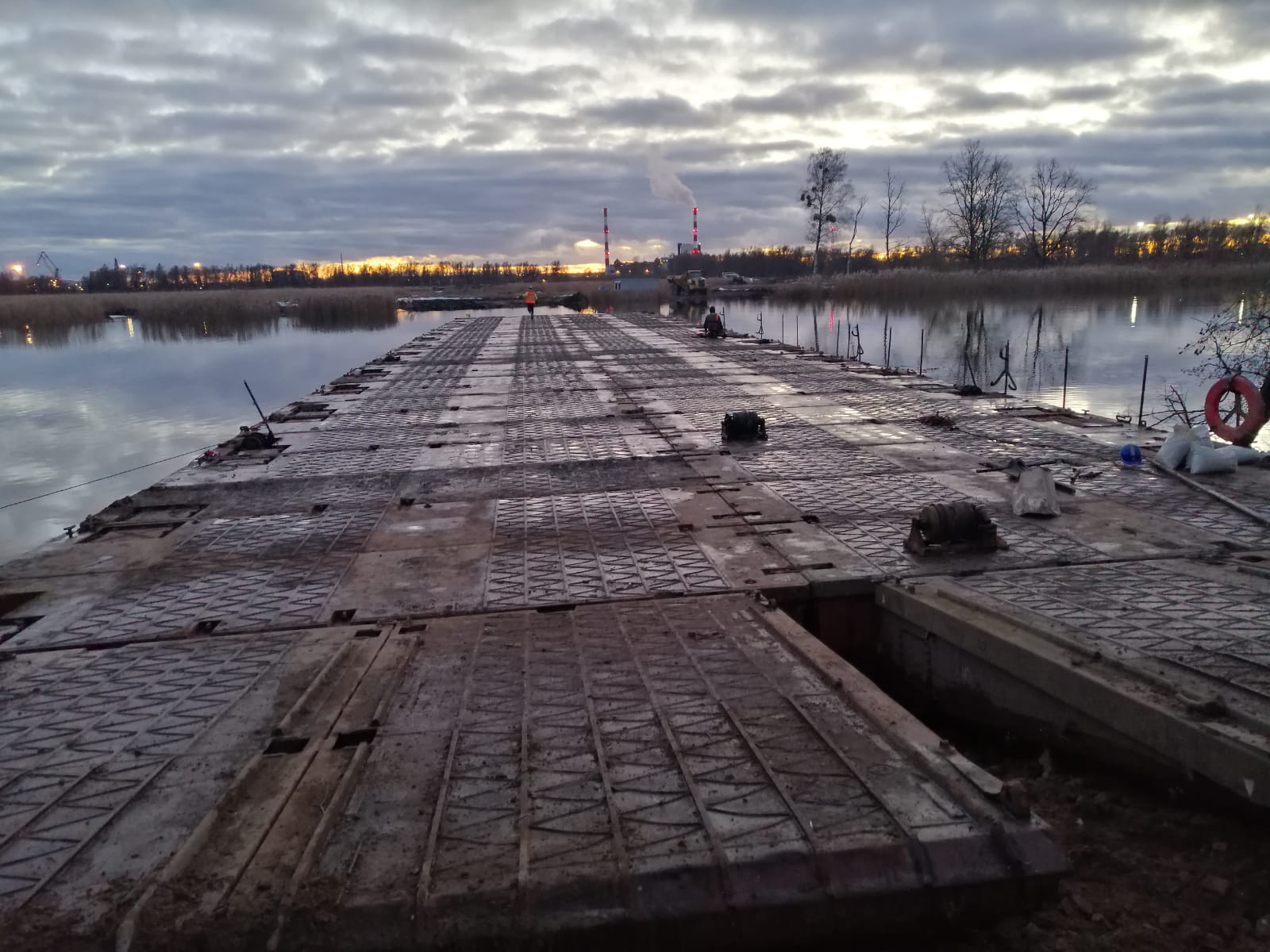 – Są to pomosty wojskowe typu PP64 „Wstęga” na potrzeby realizacji inwestycji zebraliśmy ich 120 szt. – Wskazuje dyrektor projektu z firmy NDI – Składanie odbędzie się poprzez zastosowanie montażu w podwójną wstęgę, czyli dwie nitki pomostowe łączone równolegle do siebie. Przeprawa będzie miała dużą nośność niezbędną dla wozideł, które będą przewoziły piasek do budowy obwałowań – obrazuje sytuację Piotr Arabczyk.