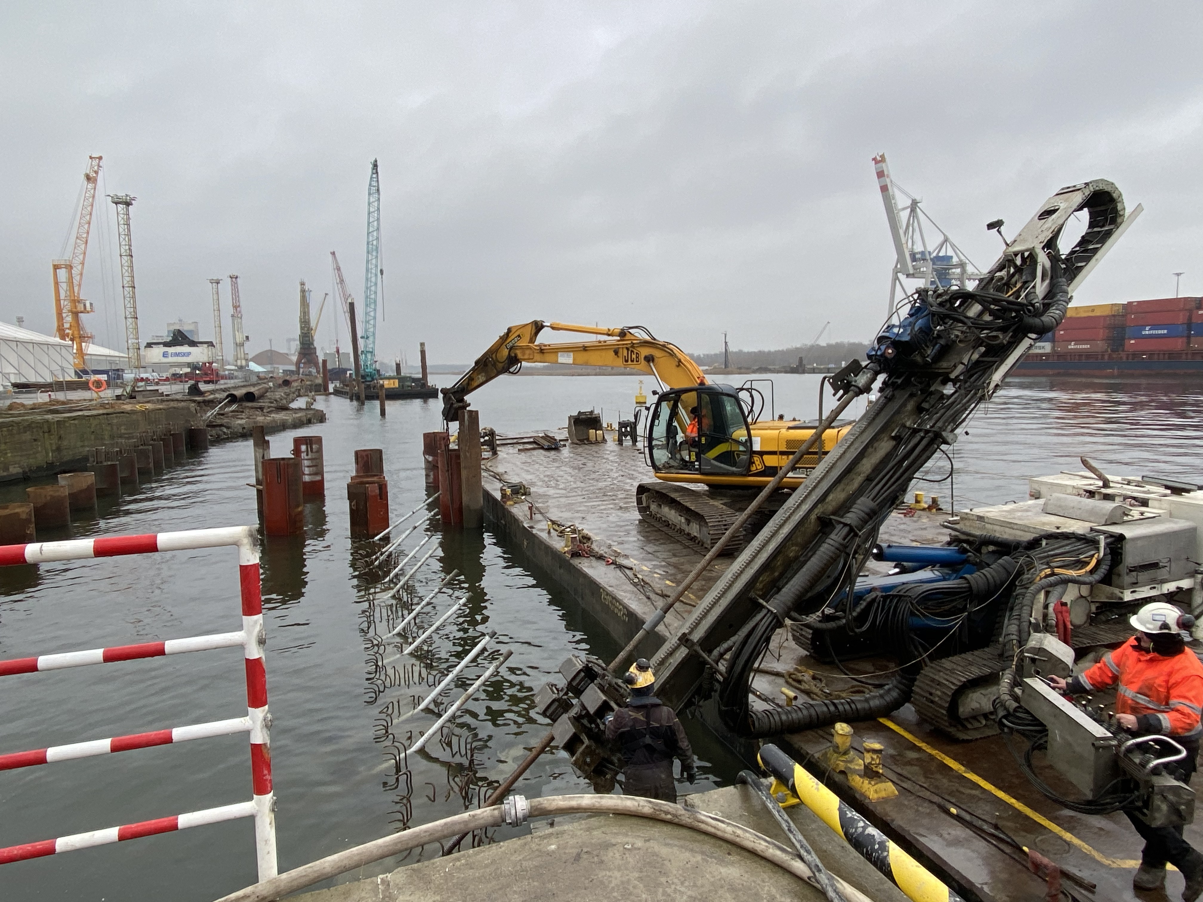 Pogrążanie ścianek szczelnych na nabrzeżu Czeskim i roboty kafarowe na nabrzeżu Norweskim i Duńskim. Poza tym budowa platformy na wyspie Ostrów Mieleński. Te prace są właśnie wykonywane w Porcie Szczecin, w ramach projektu, który ma poprawić dostęp do portu w rejonie kanału Dębickiego.