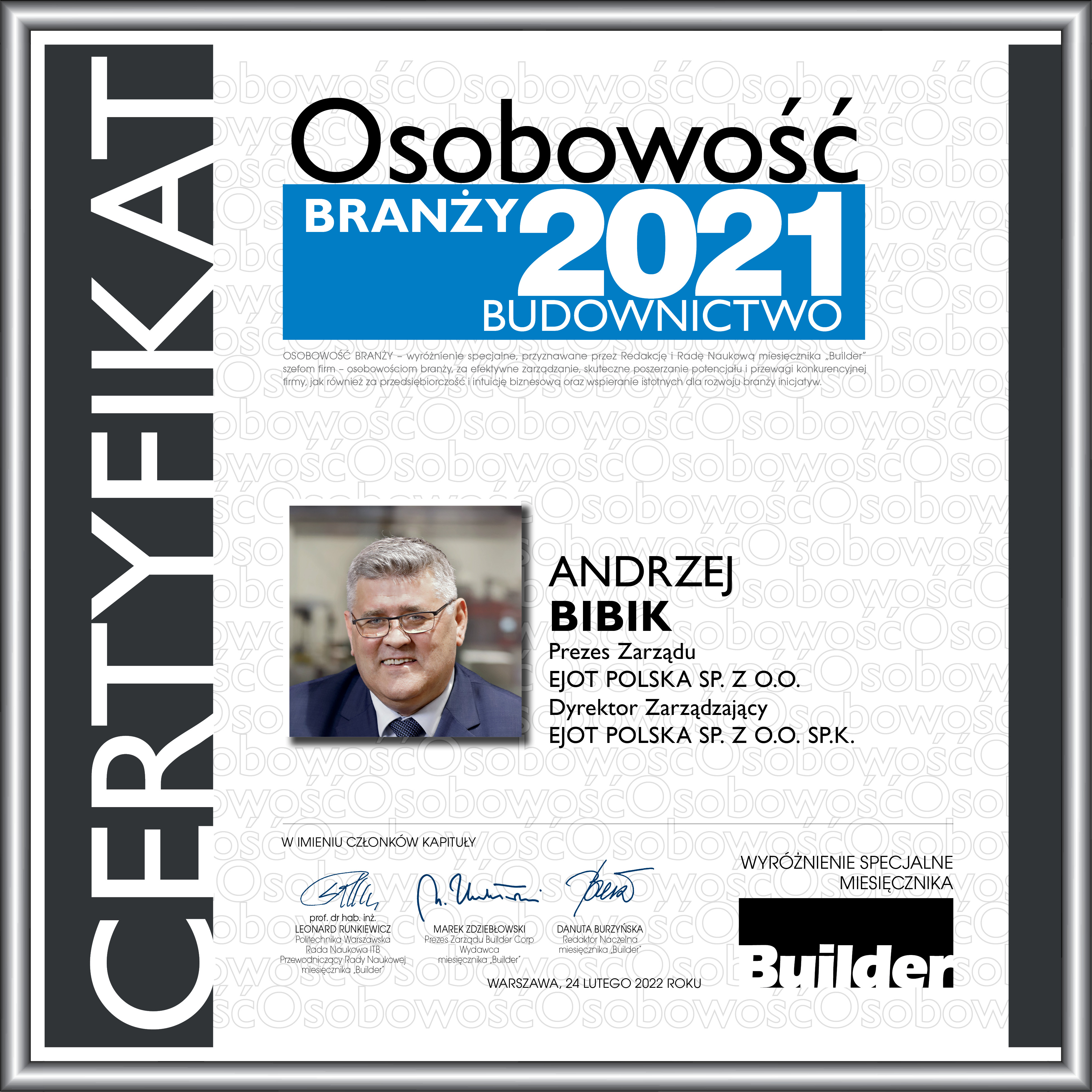 ANDRZEJ BIBIK, Prezes Zarządu EJOT Polska Sp. z o.o, Dyrektor Zarządzający EJOT Polska Sp. k. Od ponad piętnastu lat piastuje stanowisko Prezesa Zarządu EJOT Polska Sp. z o.o. W tym czasie spółka EJOT w Polsce wielokrotnie rozbudowała swoje hale produkcyjne, zainwestowała w nowe maszyny i ponad siedmiokrotnie zwiększyła swoje przychody. Jest liderem prężnie działającego zespołu, z licznymi sukcesami oraz wyróżnieniami (Złoty Medal Targów Budma, wielokrotnie Gazele Biznesu, Diamenty Forbesa, Budowlana Firma Roku, Pracodawca Organizator Pracy Bezpiecznej, Polski Herkules, Osobowość Branży Budowlanej), realizującym strategię dynamicznego rozwoju firmy. Menadżer z osiągnięciami w planowaniu strategicznym, biznesie międzynarodowym, sprzedaży i negocjacjach. Prezes firmy certyfikowanej według ISO 9001 (Zarządzanie Jakością), ISO IATF 16949 (Stan-dard dla Przemysłu Motoryzacyjnego), ISO 14001 (Zarządzanie Środowiskiem) oraz ISO 50001 (Zarządzanie Energią), której mottem przewodnim jest dewiza „EJOT Jakość łączy”. Pan Andrzej Bibik ukończył studia na Wydziale Budowy Maszyn Politechniki Gdańskiej. Karierę zawodową rozpoczynał od pracy w Elektrowni Jądrowej w Żarnowcu. W następnych latach doświadczenie zawodowe zdobywał w firmach z kapitałem zagranicznym. Od roku 1994 był związany z marką Braas, praktycznie od jej wejścia na polski rynek, przez 12 lat od-powiadał za sprzedaż w Polsce. W roku 2004 został odznaczony Srebrnym Krzyżem Zasługi za wkład w rozwój budownictwa w Polsce.