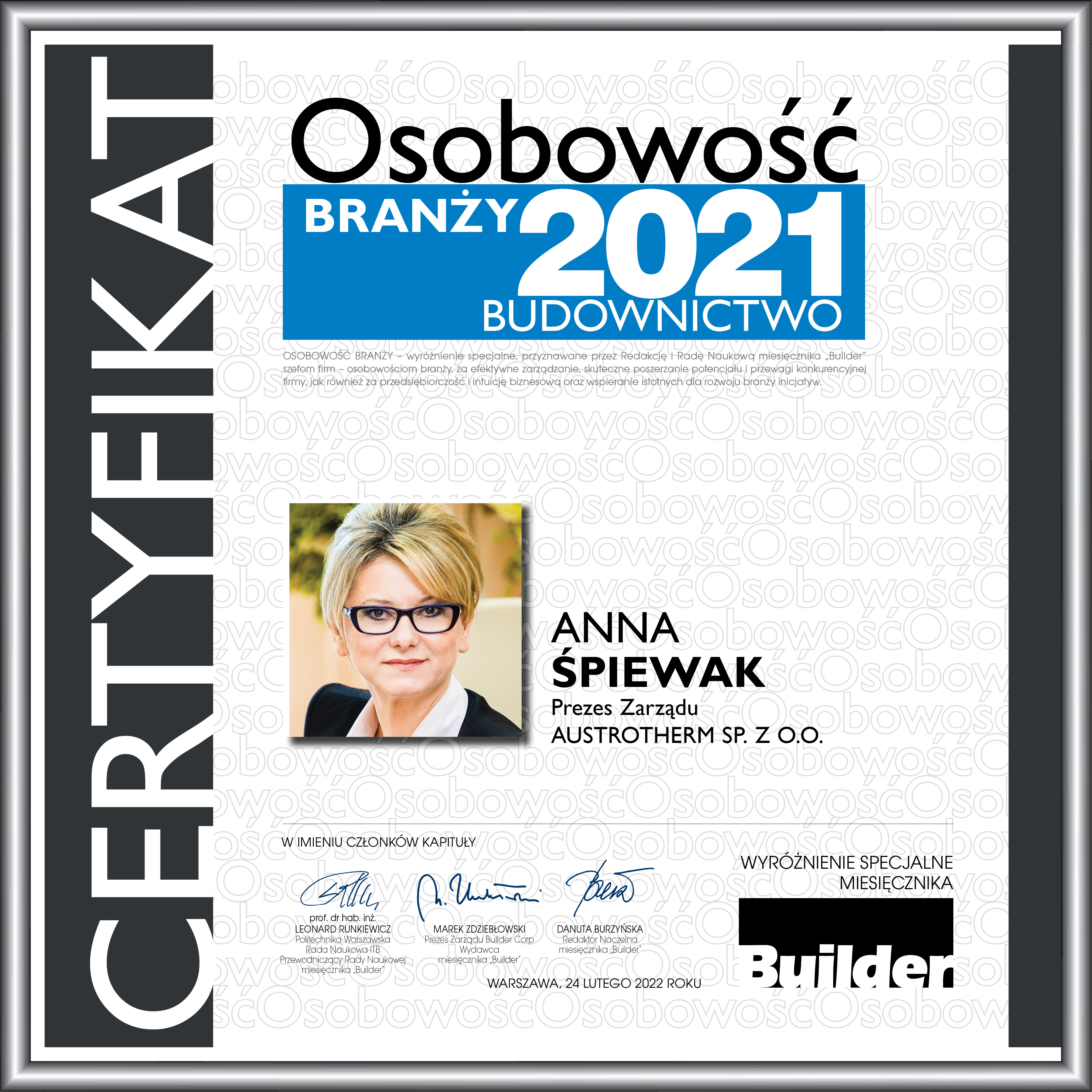 Zmagaliśmy się z brakiem surowca i szalejącymi podwyżkami jego cen, nieterminowymi dostawami, wzrostem cen energii oraz wszelkich innych zakupów. Pandemia, a właściwie spowodowane nią ograniczenia pracy urzędów, wpłynęła również na opóźnienie produkcji w nowo uruchomionym zakładzie w Grodkowie na Opolszczyźnie. Jednak mimo tych wszystkich trudności, podsumowując miniony rok, możemy pochwalić się bardzo dobrą sytuacją ekonomiczną. Firma Austrotherm osiągnęła lepsze wyniki finansowe, niż zakładaliśmy na początku roku. Myślę, że ogromny wpływ na naszą aktualną sytuację miała polityka firmy i zaangażowanie wszystkich pracowników. Zbudowaliśmy solidne fundamenty, dzięki czemu firma okazała się odporna na wszelkie rynkowe wstrząsy. Zawsze powtarzam, że kluczem do sukcesu jest uczciwość, inwestycja w jakość oraz w ludzi, którzy stanowią bezcenny kapitał firmy. To dzięki naszemu wspólnemu wysiłkowi i zaangażowaniu oraz dzięki naszym klientom, którzy darzą nas zaufaniem, co roku odnosimy kolejne sukcesy. Na nowy rok życzę przede wszystkim dużo zdrowia, sukcesów i powrotu do normalności. Radzie Programowej oraz Redakcji miesięcznika „Builder” pragnę serdecznie podziękować za kolejne cenne wyróżnienie, które dedykuję pracownikom firmy Austrotherm i wszystkim naszym odbiorcom.