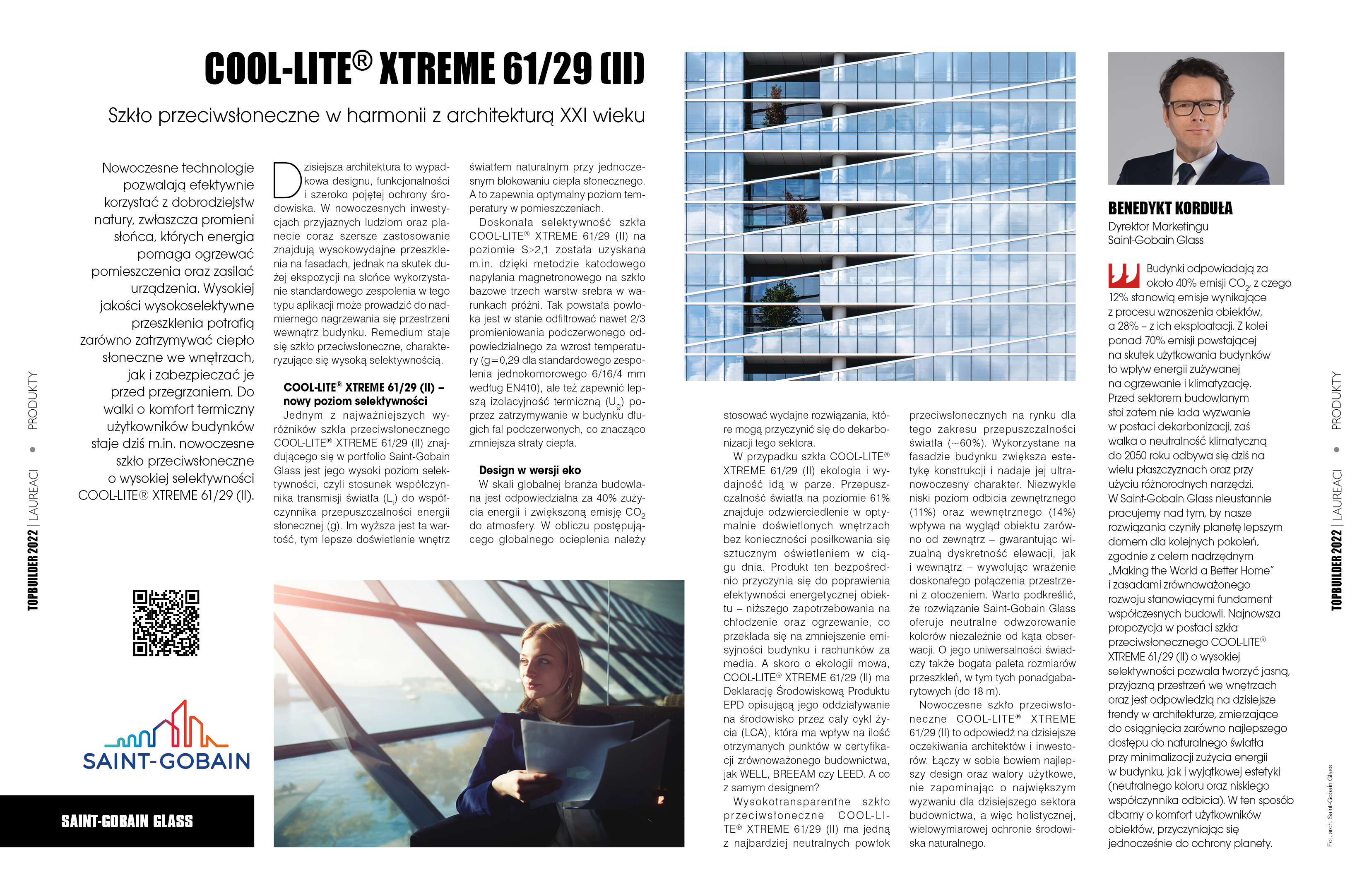 Nowoczesne technologie pozwalają efektywnie korzystać z dobrodziejstw natury, zwłaszcza promieni słońca, których energia pomaga ogrzewać pomieszczenia oraz zasilać urządzenia. Wysokiej jakości wysokoselektywne przeszklenia potrafią zarówno zatrzymywać ciepło słoneczne we wnętrzach, jak i zabezpieczać je przed przegrzaniem. Do walki o komfort termiczny użytkowników budynków staje dziś m.in. nowoczesne szkło przeciwsłoneczne o wysokiej selektywności COOL-LITE® XTREME 61/29 (II).