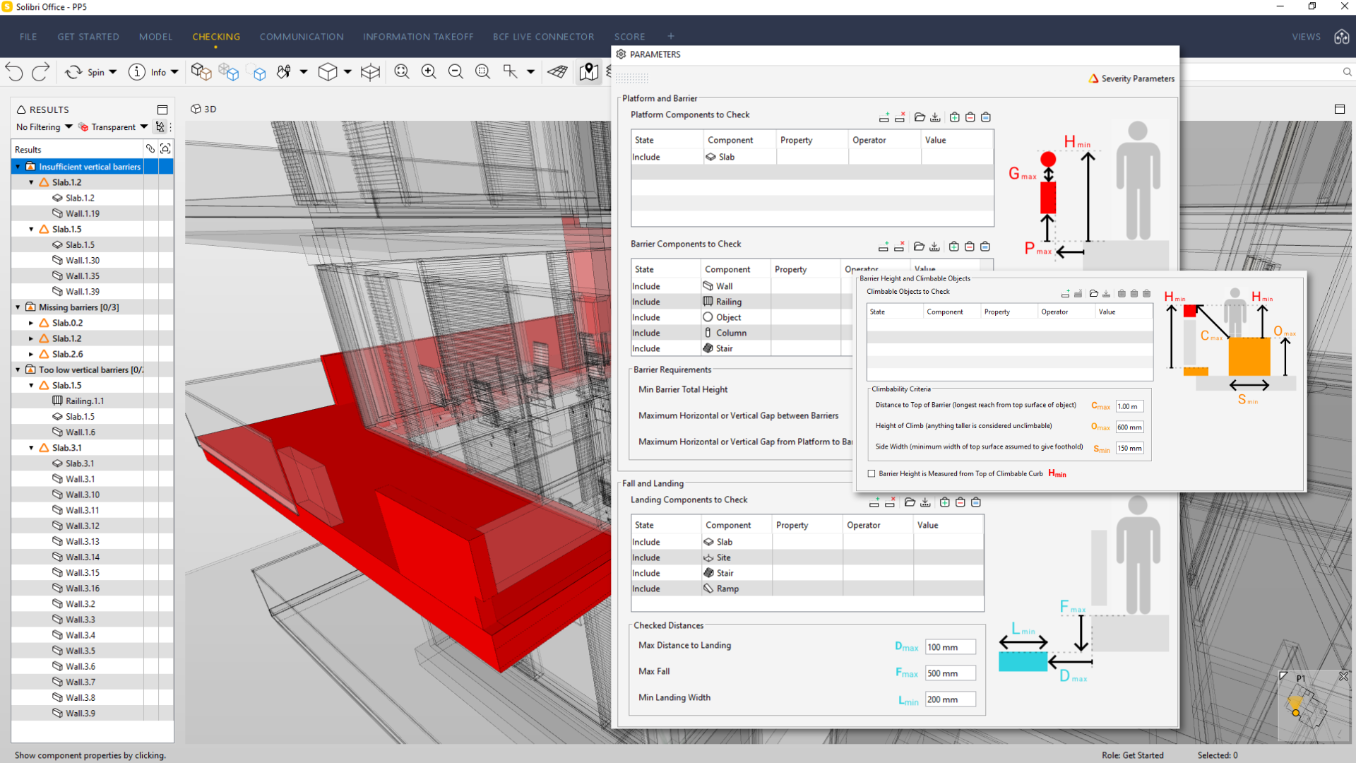 Rys. 2 Zastosowanie reguły analizy zabezpieczenia poziomy powierzchni przed upadkiem w programie Solibri Office