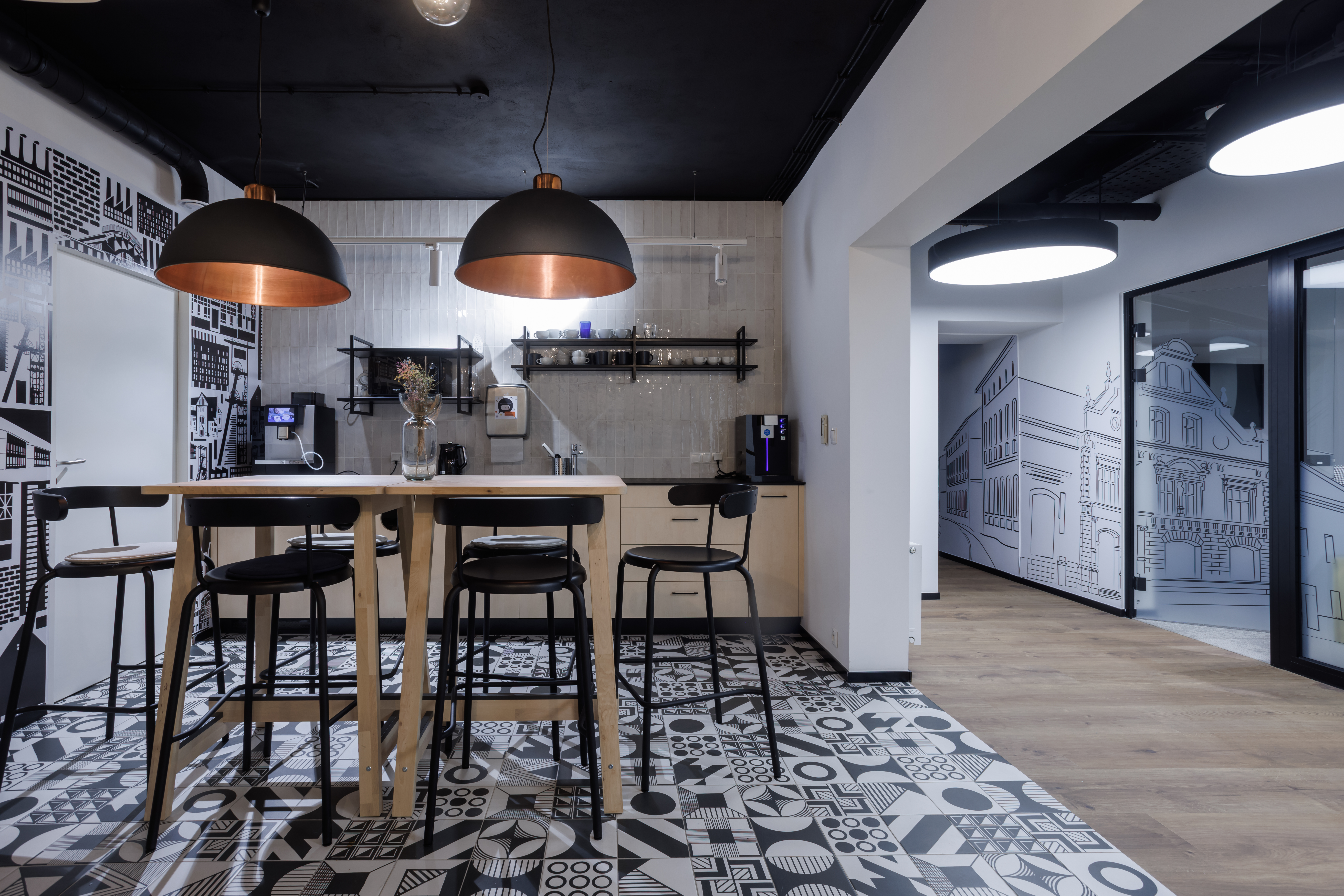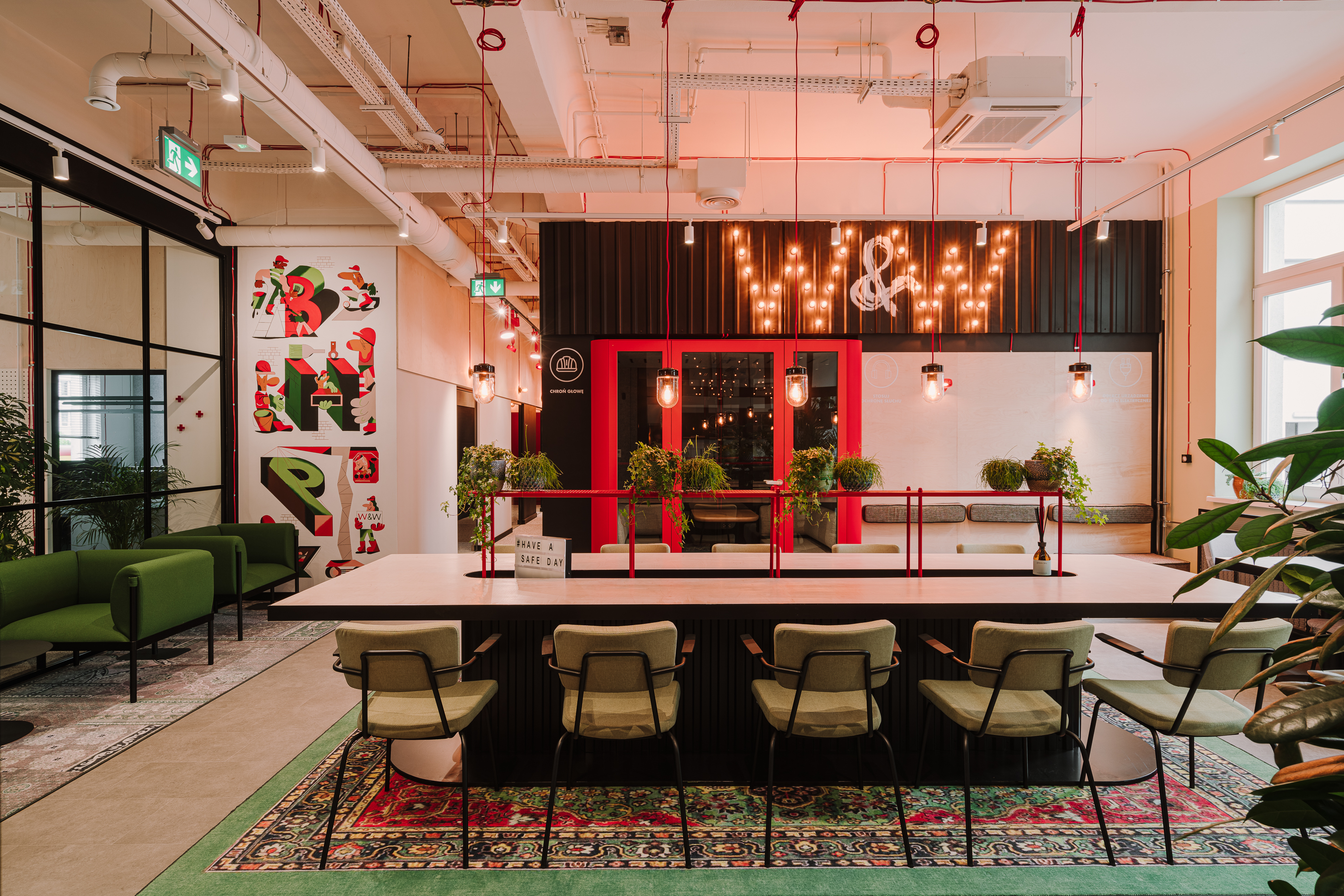 Architektura wnętrz daje dużą wolność projektantom i przestrzeń do ujścia ich artystycznej energii. Jednak aranżacja danej powierzchni to nie tylko kreatywne pole działania, ale przede wszystkim stworzenie bazy do życia w niej. Jak na malarskim płótnie – projektujemy kompozycje, testujemy proporcje oraz relacje kolorystyczne. Od lat przyglądamy się psychologii koloru, a także sprawdzamy, jak dobór palety barw wpływa na nasz organizm i samopoczucie. Projektujemy wnętrza użyteczności publicznej, miejsca pracy, gdzie pracownicy spędzają wiele godzin. Zawsze staramy się, aby zaprojektowane przestrzenie były komfortowe, przyjazne, pobudzały do działania lub relaksowały – w zależności od potrzeb. Biuro W&W Consulting w Warszawie jest świetnym przykładem tego, jak wiele we wnętrzu zależy od doboru odpowiedniej kolorystyki. Przede wszystkim wsłuchaliśmy się w prośbę klienta, aby odejść od sztywnego i sztampowego wizerunku firm BHP. Kolorystyka była świetnym nośnikiem naszego pomysłu. Sufit, ściany, posadzka, czyli „tło” wnętrza skąpane są w bieli, czerni oraz jasnych szarościach. Podkreśliliśmy w ten sposób loftowy klimat biura i stworzyliśmy bazę do dalszych działań. Akcenty w postaci czerwieni i zieleni dodają energii oraz świeżości. Czerwień często pojawia się na tablicach BHP, stąd naturalne do nich nawiązanie, zieleń natomiast to z jednej strony ukłon w kierunku kolorystyki logo W&W Consulting, a z drugiej stworzenie równowagi dla energicznej czerwieni. Dzięki pomalowaniu konstrukcyjnych elementów, a także detali na czerwono zwracamy uwagę na to, co często we wnętrzach staramy się ukrywać: kable czy reflektory. Tym razem uznaliśmy jednak, że należy takie elementy podkreślić, co nada charakteru całości. Wzorzyste, bogate dywany oraz humorystyczne grafiki ilustratora Karola Banacha dodają lekkości i przytulności. Zgodnie z zasadą „safety first, but it can be cool!”.