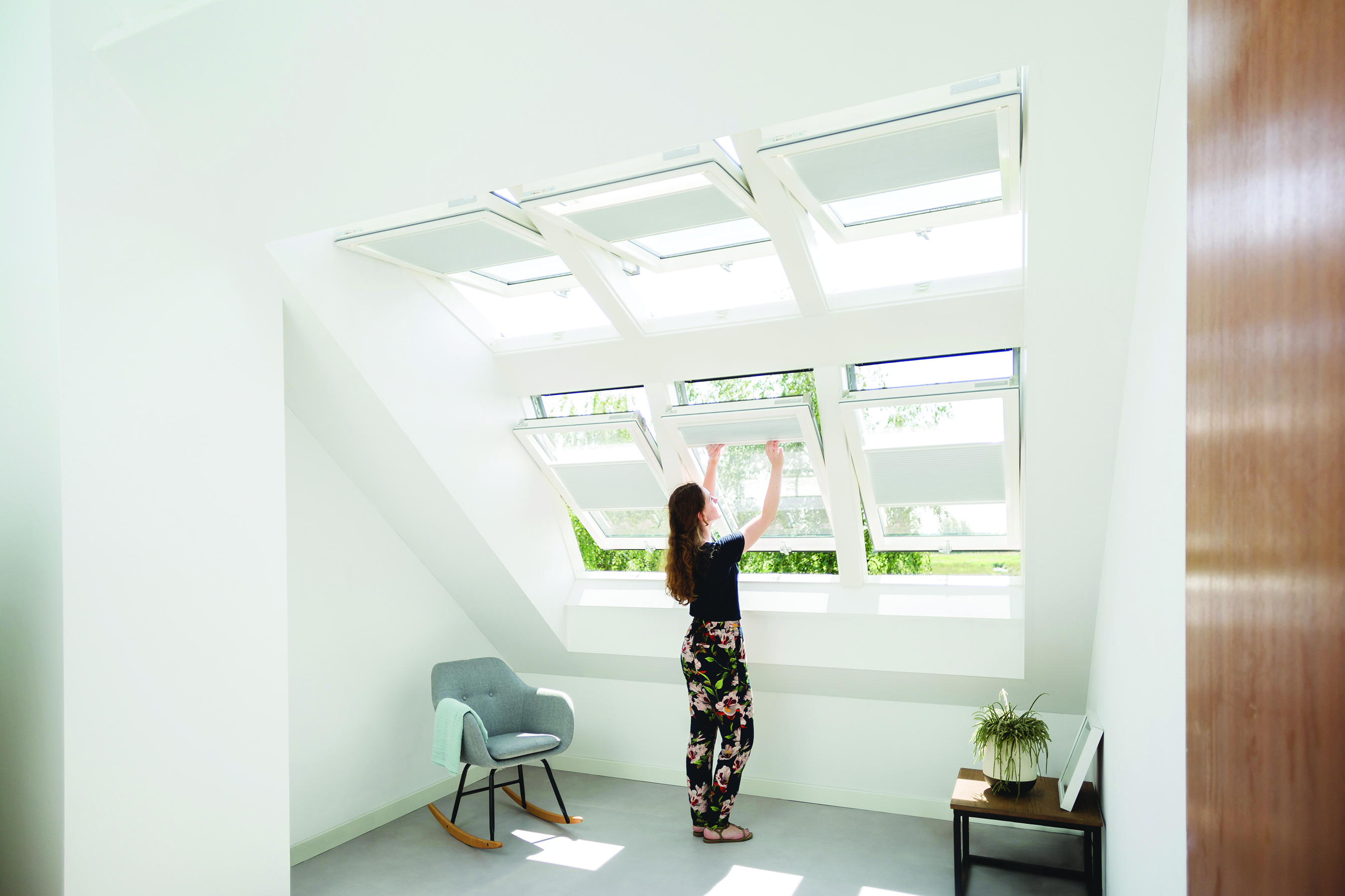 „Nowa lukarna robi ogromną różnicę. Szereg okien dachowych sprawia, że dużo dodatkowego światła dociera do wnętrza pod różnymi kątami. W rezultacie pokój na poddaszu wydaje się bardziej przestronny. Aby jeszcze bardziej cieszyć się widokiem, zdecydowaliśmy się dodać trzy okna uchylno-obrotowe w dolnym rzędzie lukarny. Otwierając okno zostawiamy je zwykle w pozycji uchylnej. Dzięki temu mamy wyraźny widok na zewnątrz i możemy nawet stanąć pod oknem” – dodaje właściciel.