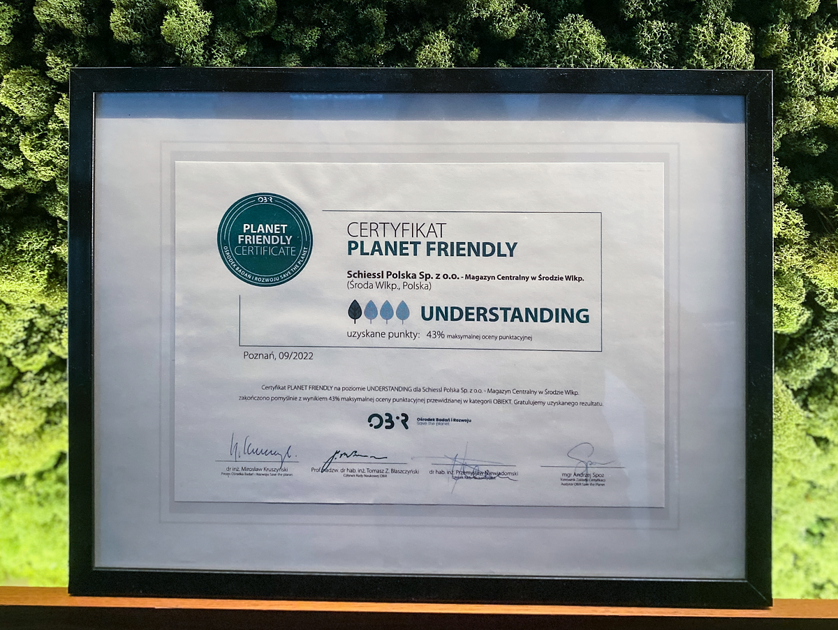 – Jesteśmy nowoczesnym i dynamicznie rozwijającym się przedsiębiorstwem, które działa zgodnie z zasadami zrównoważonego rozwoju – mówi Zygmunt Niziński, dyrektor ds. logistyki w Schiessl Polska. – Uzyskany przez nas Certyfikat Planet Friendly jest tego potwierdzeniem. Na terenie obiektu w Środzie Wielkopolskiej działa m.in. instalacja fotowoltaiczna o mocy 49,14 kWp. Pozwala to na roczne zmniejszenie emisji CO2 o 42 tony. Dzięki wymianie urządzeń HVAC-R, została zmniejszona konsumpcja energii. Zainstalowano także perlatory napowietrzające wodę, przyczyniając się do mniejszego jej zużycia.