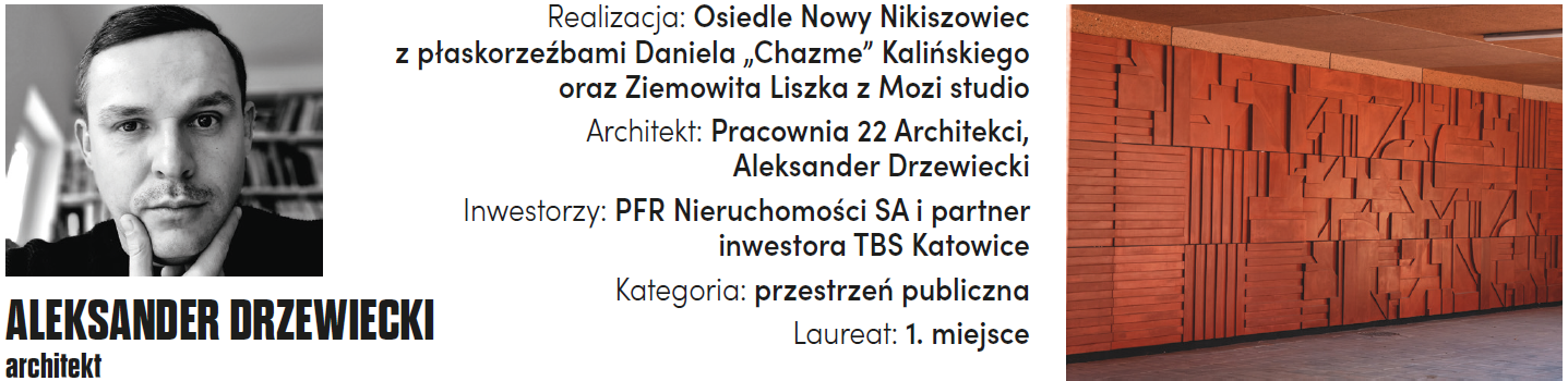 Sztuka odgrywa niebagatelną rolę w odbiorze architektury. Zważywszy, że sama architektura jest sztuką, czasami nie widać granicy między jednym a drugim. Z punktu widzenia projektowanych budynków obecność sztuki nadaje im tożsamość, pozwala użytkownikom identyfikować się z odwiedzanym, użytkowanym lub zamieszkiwanym miejscem. W przypadku Nowego Nikiszowca od początku naszym celem było stworzenie tożsamości osiedla, nie tylko samą architekturą, ale też za pomocą środków artystycznych. Inspiracją były liczne przykłady modernistycznych budynków z okresu lat 70., które często wykorzystywały motyw mozaiki. Chcieliśmy wpleść w architekturę element lokalnej identyfikacji. Udało się to poprzez stworzenie mozaik z grafikami nawiązującymi do wątków ceglanych widzianych na historycznym Nikiszowcu oraz zwieńczenie placu płaskorzeźbą autorstwa Daniela Kalińskiego, czerpiącą inspiracje ze śląskiego dziedzictwa.
