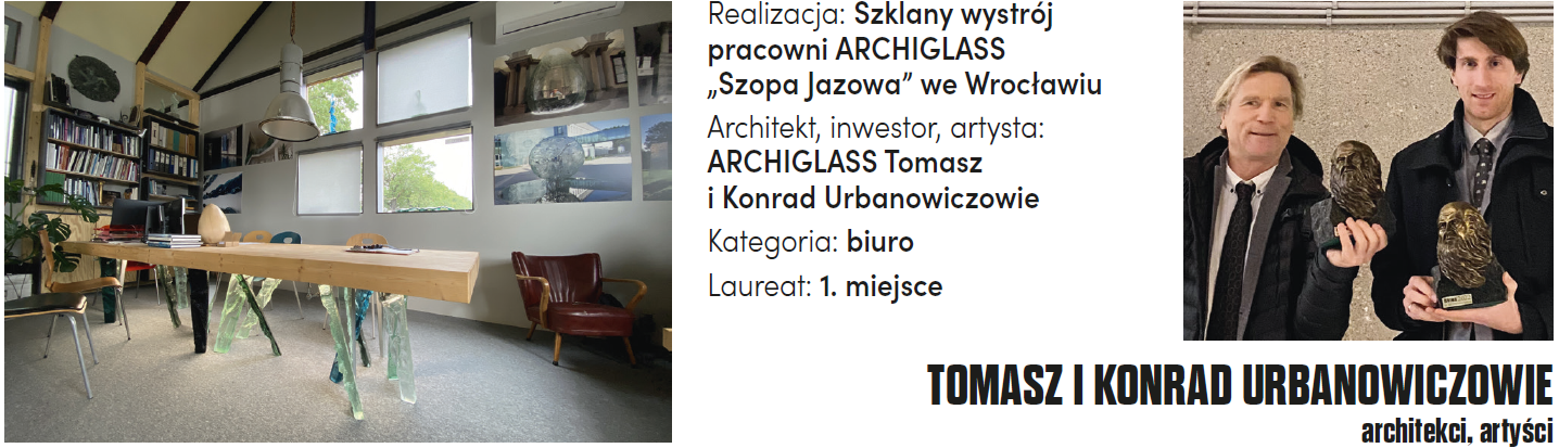 Projektowanie i realizacja szklanego wystroju „Szopy Jazowej” we Wrocławiu były dla nas zadaniem wyjątkowym, bo występowaliśmy zarówno w roli inwestora, jak i projektanta oraz twórcy obiektów artystycznych. Budynek, pełniący niegdyś funkcję przyrzecznego magazynu, przywróciliśmy do życia jako autorskie atelier. Zaawansowana technologicznie huta szkła odlewanego łączy się tu z gotowymi obiektami sztuki. Historia i charakter lokalizacji zawarte są w stałych i zmiennych elementach wystroju, obejmujących szklane podstawy i autorskie obiekty oświetleniowe oraz przegrody i artystyczne detale, dopełniające w sposób nowoczesny to indywidualne, zabytkowe wnętrze…