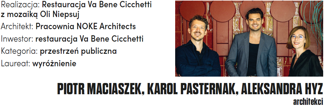 Va Bene Cicchetti jest to projekt szczególny, ponieważ opiera się na ścisłej współpracy z artystką Olą Niepsuj od samego początku projektu. Dzięki tej kooperacji udało się stworzyć wyjątkową mozaikę, która wchodzi w dialog z istniejącą wokół architekturą. Lokalizacja lokalu – warszawski MDM – najczęściej kojarzy się z monumentalnym budownictwem uzupełnionym o doskonałe rzemiosło dekoratorskie. Trudno było się oprzeć pokusie połączenia tradycji lokalnej z włoską – stąd pomysł stworzenia autorskiej mozaiki. Choć sprawia wrażenie, że zawsze tam była, ta ścienna kompozycja powstała na zamówienie właścicieli i przy wykorzystaniu w dużej mierze materiałów „z drugiego obiegu”. Przez tę synergię sztuki i designu powstał projekt naprawdę wyjątkowy, z którego jesteśmy bardzo dumni…