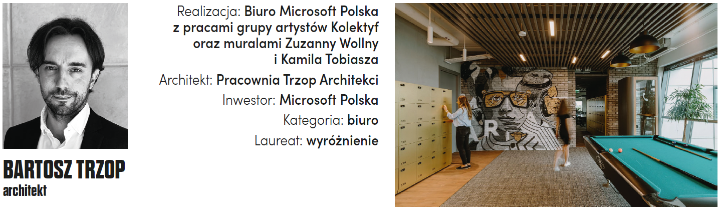 Sztuka i architektura od zawsze się przenikają. Bardzo cieszy nas zatem fakt, że inwestorzy dostrzegli potrzebę obecności sztuki również w przestrzeniach biurowych. Sztuka we wnętrzu jest nie tylko elementem dekoracyjnym, ale działa na użytkowników inspirująco i relaksująco. Skłania do refleksji, a dobrane w odpowiedniej kolorystyce obrazy czy murale potrafią działać również energetyzująco i pobudzająco na odbiorcę. Pracownicy biur, w których sztuka odgrywa ważną rolę, wyraźnie wskazują na lepsze samopoczucie w takich przestrzeniach. Ponadto murale przedstawiające polskich naukowców w biurze Microsoft pozwalają nadać przestrzeni lokalny akcent, a pracownikom bardziej utożsamiać się z firmą.