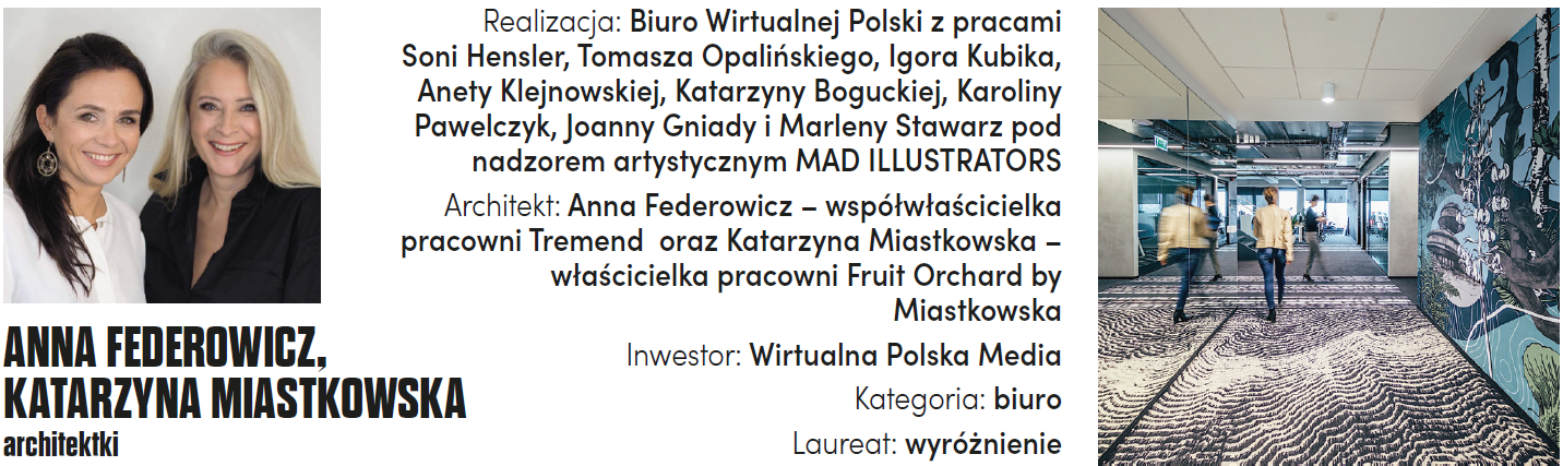 Układ biura Wirtualnej Polski podzieliliśmy na strefy funkcjonalne, w tym między innymi „green zony”, służące wyciszeniu i odpoczynkowi od pracy przy biurku. Chciałyśmy, aby nastrój uzupełniły kojarzące się z wypoczynkiem polskie regiony turystyczne, jak: Mazury, Bieszczady, Podhale, Pomorze, Hel i inne. Stąd powstał pomysł na specjalnie zaprojektowane tematyczne, „chillujące” murale. Jest to kontynuacja koncepcji z poprzedniej siedziby firmy, gdzie miejsca przeznaczone do pracy były wypełnione wielkoformatową, artystyczną, dynamiczną fotografią polskich miast. Poza green zonami dodatkowe murale tematyczne znalazły się też w Klubie WP i w kuchniach…