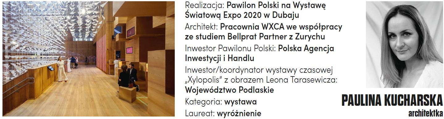 W przypadku Pawilonu Polski i wystawy „Xylopolis” wiele wątków jest ze sobą zbieżnych. Zaprojektowany przez naszą pracownię pawilon to opowiedziana językiem architektury wielowątkowa opowieść o mądrym przetwarzaniu natury, polskim krajobrazie i technologii budownictwa drewnianego. Główne dzieło malarskie prezentowane na wystawie wykonał Leon Tarasewicz, artysta silnie związany z Podlasiem – miejscem będącym ostoją bezkresnej, dzikiej przyrody oraz macierzą architektury drewnianej. Architektura i sztuka poruszały wspólne tematy, dopełniały się w formie i wyrazie. Dzięki temu w Pawilonie Polski każdy ze zwiedzających mógł zanurzyć się w wielowymiarowym doświadczeniu złożonym z wrażeń, historii i obrazów.