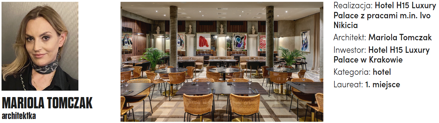 Pierwsze piętro tego obiektu jest przepełnione historią. Dla przełamania tego muzealnego charakteru postanowiłam wprowadzić ducha naszych czasów w postaci abstrakcyjnych obrazów – dla mnie portretów prowadzących dialog z historycznymi dziełami. Są to prace Ivo Nikicia, który podjął się, oprócz obrazów i printów, współpracować nad przestrzenną instalacją, która zaaranżowała przepiękną historyczną klatkę schodową z czarnego dębu. Abstrakcyjne, bardzo kolorowe prace Ivo nadały wnętrzom świeżość i poprzez kolor wniosły radość z przebywania w ich obecności. Identyfikację stref w postaci graficznych kasetonów wykonała Rita Zimmermann. Architektura i sztuka splatają się w tym obiekcie na każdym kroku i pokazują, jak bardzo ważną rolę współtworzącą obiekt pełni sztuka w architekturze…