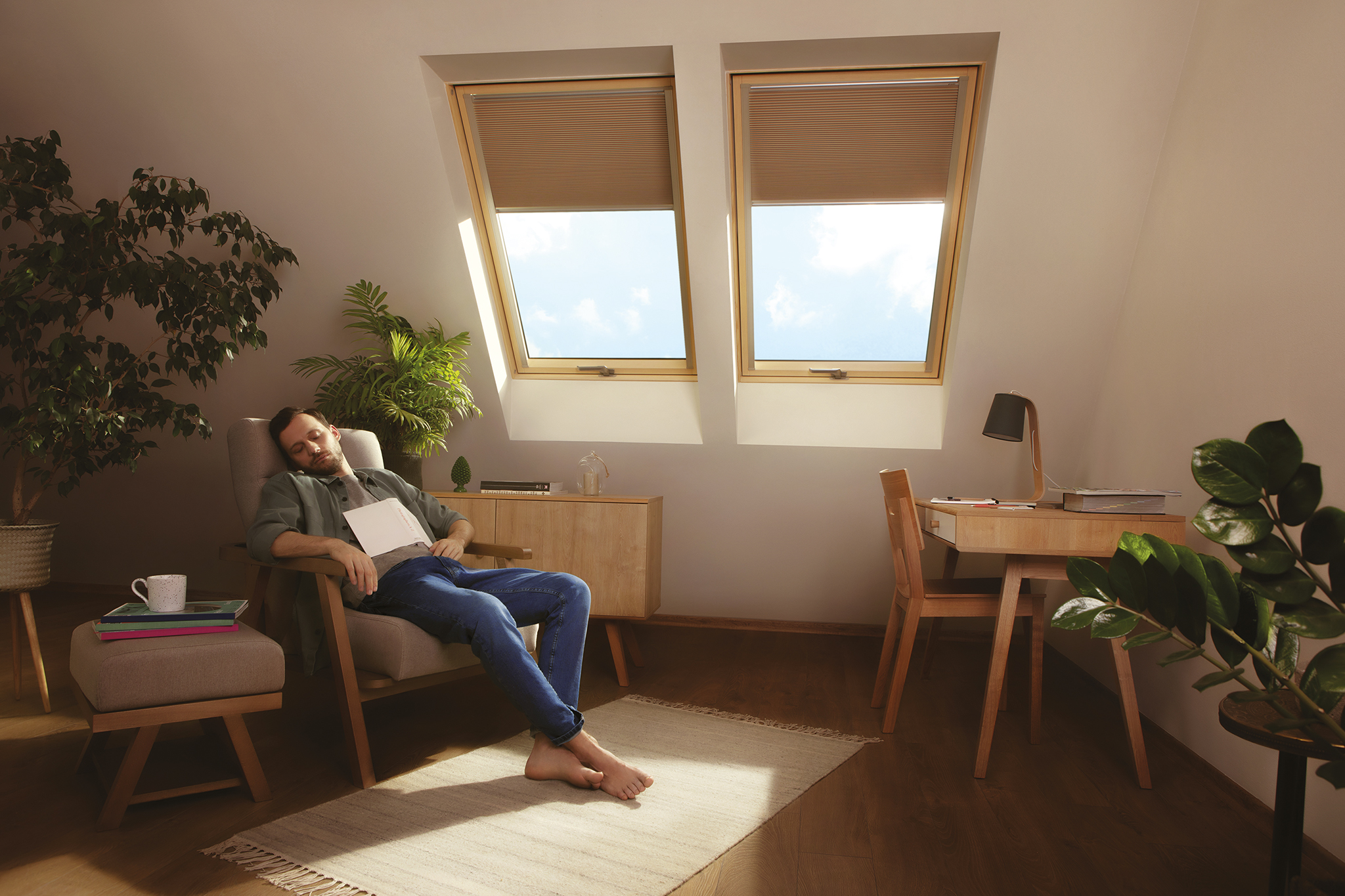 Folia dźwiękoizolacyjna zastosowana w pakiecie szybowym nowych okien FAKRO chroni przed przenikaniem hałasu z zewnątrz, dzięki czemu mieszkańcy mogę cieszyć się spokojem podczas odpoczynku w swoim domu. FAKRO)