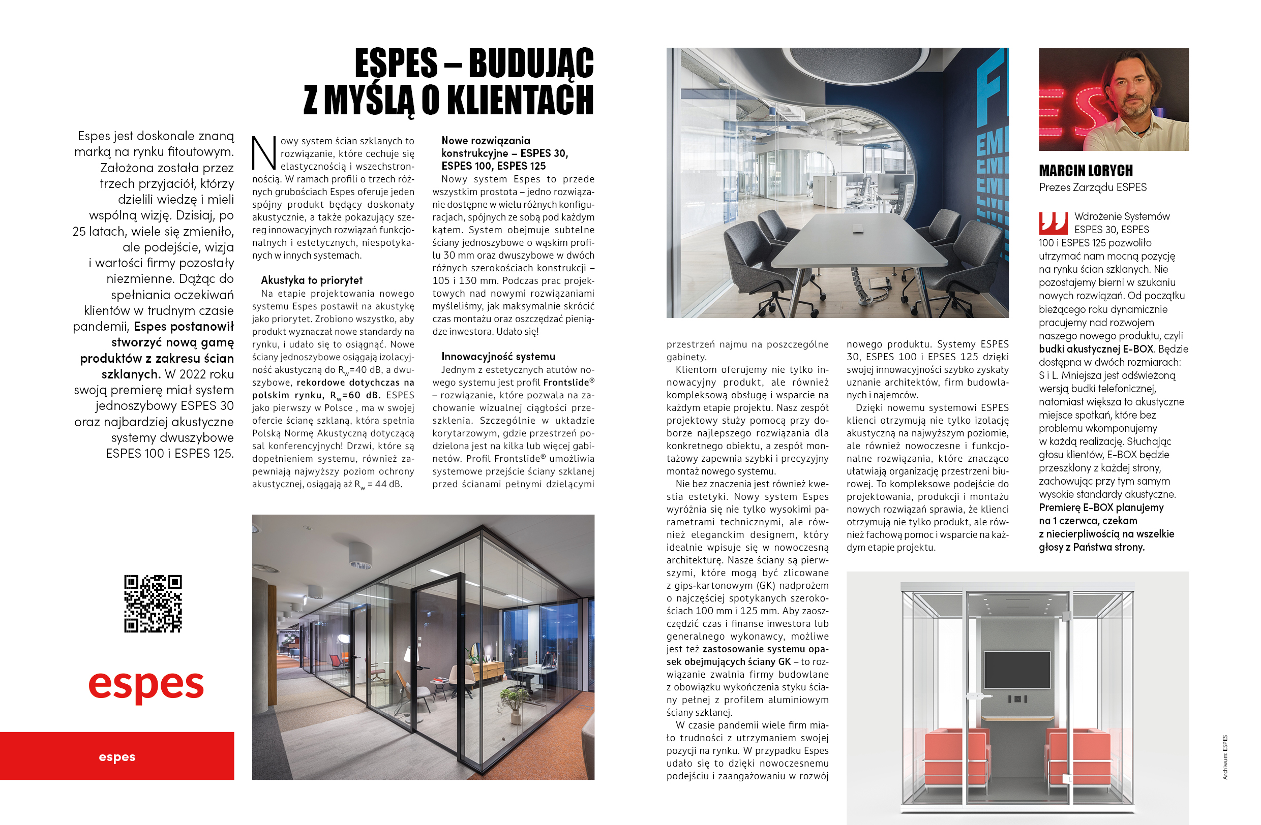 Espes jest doskonale znaną marką na rynku fitoutowym. Założona została przez trzech przyjaciół, którzy dzielili wiedzę i mieli wspólną wizję. Dzisiaj, po 25 latach, wiele się zmieniło, ale podejście, wizja i wartości firmy pozostały niezmienne. Dążąc do spełniania oczekiwań klientów w trudnym czasie pandemii, Espes postanowił stworzyć nową gamę produktów z zakresu ścian szklanych. W 2022 roku swoją premierę miał system jednoszybowy ESPES 30 oraz najbardziej akustyczne systemy dwuszybowe ESPES 100 i ESPES 125.
