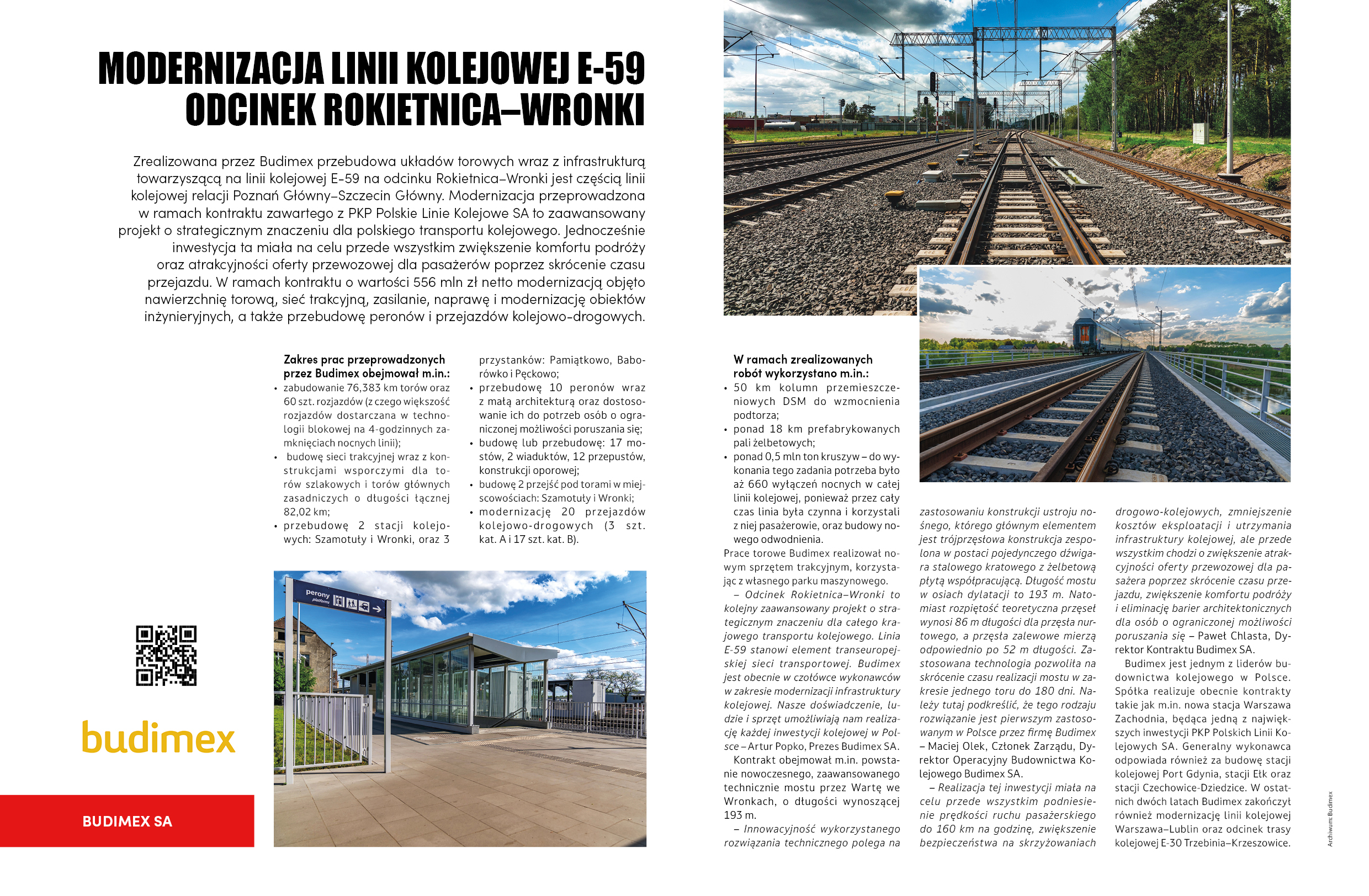 Zrealizowana przez Budimex przebudowa układów torowych wraz z infrastrukturą towarzyszącą na Linii kolejowej E-59 na odcinku Rokietnica–Wronki jest częścią linii kolejowej relacji Poznań Główny–Szczecin Główny. Modernizacja przeprowadzona w ramach kontraktu zawartego z PKP Polskie Linie Kolejowe SA to zaawansowany projekt o strategicznym znaczeniu dla polskiego transportu Kolejowego. Jednocześnie inwestycja ta miała na celu przede wszystkim zwiększenie komfortu podróży oraz atrakcyjności oferty przewozowej dla pasażerów poprzez skrócenie czasu przejazdu. W ramach kontraktu o wartości 556 mln zł netto modernizacją objęto nawierzchnię torową, sieć trakcyjną, zasilanie, naprawę i modernizację obiektów inżynieryjnych, a także przebudowę peronów i przejazdów kolejowo-drogowych.