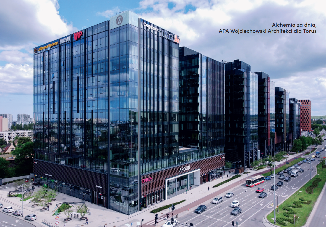 Budujące długą część pierzei alei Grunwaldzkiej w Gdańsku biurowce zaprojektowane przez APA Wojciechowski Architekci dla Torus to świetny przykład zastosowania oświetlenia sztucznego, który zmienia charakter odbioru budynku po zmroku. Za dnia kompleks Alchemia tworzy ścianę grzebieniowo ustawionych budynków z harmonijnym rytmem szklanych fasad ustawionych na podiach o ceglanym kolorze.
