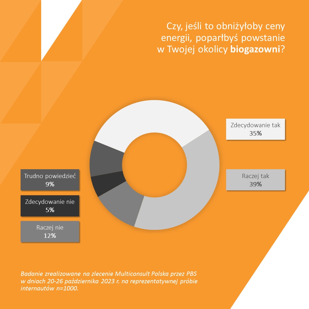 Jak na kraj będący jednym z największych w Europie producentów żywności, mamy znacznie większy potencjał wykorzystania odpadów produkowanych przez tę branżę. Ostatnie nowelizacje Prawa energetycznego dotyczące linii bezpośrednich mają ułatwić przedsiębiorstwom z branży rolniczej możliwość produkcji energii odnawialnej w bezpośrednim sąsiedztwie zakładu i jej konsumpcję na miejscu, bez konieczności odłączania się od Krajowego Systemu Energii. Jednocześnie badania wskazują na akceptację społeczną dla tworzenia obiektów tego typu. Blisko trzy czwarte badanych (74%) deklaruje, że poparłoby budowę wytwórni energii i ciepła z odpadów zwierzęcych i roślinnych w swojej okolicy, jeśli przyczyniłoby się to do obniżenia rachunków.