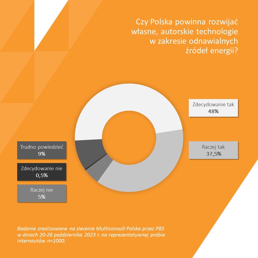 Jak wynika z badania sopockiej pracowni PBS przeprowadzonego na zlecenie firmy doradczej Multiconsult Polska, Polacy widzą potrzebę transformacji energetycznej w oparciu o rozwój odnawialnych źródeł energii. Według badanych, Polska powinna się skupić na rozwijaniu własnych technologii (85%), finansowaniu prosumenckich instalacji fotowoltaicznych (74%) oraz stawianiu magazynów energii (47%).
