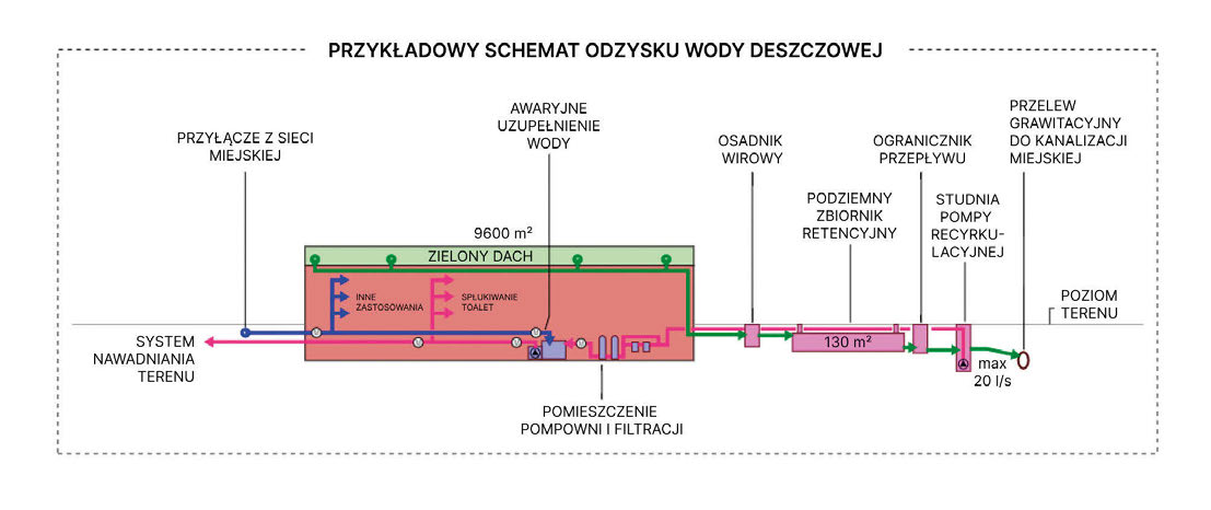 Stosowane przez nas rozwiązania obejmują między innymi systemy gromadzenia wody deszczowej, które mogą być wykorzystywane do różnych celów. Przykładowo woda może być używana do spłukiwania toalet lub jako zasób do nawadniania terenów zieleni, co jest szczególnie istotne w obszarach miejskich. Systemy te nie tylko zwiększają efektywność wykorzystania wody, ale także odgrywają ważną rolę w adaptacji miast do zmieniającego się klimatu. Przykładowy system pokazano na schemacie.