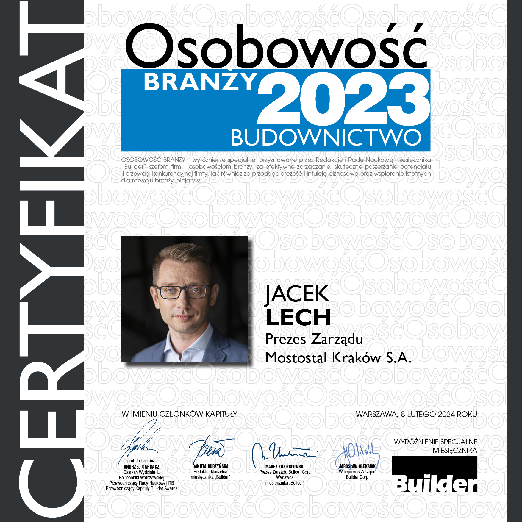 Wychodzę z założenia, że brak rozwoju to krok wstecz. Jako lider trzymam się tej zasady, bo wierzę, że dążenie do wzrostu, szukanie innowacyjnych rozwiązań i nowych inicjatyw strategicznych to gwarancja rozwoju organizacji. Rok 2023 był dla Mostostalu Kraków historycznym pod wieloma względami – wypracowaliśmy najwyższy w historii poziom sprzedaży i kontraktacji, zainwestowaliśmy w zakup spółki Konstalex, z branży konstrukcji stalowych, tym samym zwiększając nasz potencjał wytwórczy do 18 tys. ton rocznie, oraz jeszcze mocniej weszliśmy na rynek niemiecki, oferując poza usługami prefabrykacji konstrukcji stalowych również prefabrykację konstrukcji żelbetowych, będących dotychczas częścią biznesu prowadzoną przez Budimex. Od początku roku sprawujemy na terenie Niemiec działalność operacyjną poprzez Biuro Rynku Niemieckiego z oddziałem w Kolonii. Wszystkie te działania pozwalają nam mierzyć jeszcze wyżej i stawiać sobie kolejne ambitne cele. To wszystko nie udałoby się bez ciężkiej pracy naszej kadry, która jest największą wartością naszej firmy. Dzisiaj mówimy o Grupie Mostostal Kraków, która zatrudnia łącznie ponad 1600 pracowników. Nominacja do tytułu Budowlanej Firmy Roku 2023 to dla nas duże wyróżnienie. Cieszę się, że zeszłoroczne działania spółki zostały zauważone i docenione. Mogę zapewnić, że przed nami jeszcze wiele wyzwań i nowych kierunków rozwoju, którymi zaskoczymy naszych partnerów biznesowych.