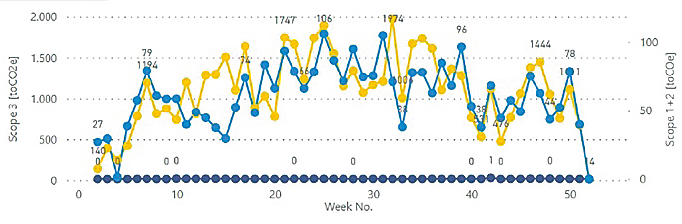 Rys. 1. Keller Austria – kompleksowy raport emisji CO2 dla zakresów 1–3 z podziałem na tygodnie