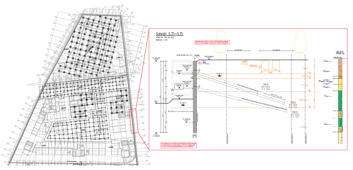 We Frankfurcie nad Menem firma Keller zaprojektowała i wykonała zabezpieczenie wykopu wraz z robotami ziemnymi. Projekt przewidywał trzykondygnacyjny wykop o średniej głębokości sięgającej 13 m p.p.t. Jednym z istotnych geotechnicznych wyzwań było zagłębienie się ok. 3 m poniżej stropu skał wapiennych. Poniżej wapieni zalegały iły frankfurckie, wymagające głębokiego palowania. Mając na uwadze lokalne warunki gruntowe, zabezpieczenie wykopu zaprojektowano jako palisadę z pali w orurowaniu CCFA (Cased Continuous Flight Auger), a palowanie pod część wysoką w postaci pali wierconych o średnicy 1,5 m. Keller zaproponował największą redukcję emisji CO2 w stosunku do rozwiązania o ryginalnego na etapie wyboru wykonawcy. Kotwienie palisady zaprojektowano i wykonano z zastosowaniem kotew wielobuławowych SBMA. Dzięki temu zmniejszono liczbę kotew, a co za tym idzie – materiału i urobku. Palownice zasilane były paliwem HVO zamiast typowego ON. HVO jest to paliwo wytworzone z uwodorowienia olejów roślinnych, dzięki czemu redukuje się emisje ze spalania nawet do 90 proc. Istotne pod względem redukcji emisji CO2 były zaproponowane zmiany składu mieszaniny betonowej oraz zaczynu cementowego do wykonania kotew oraz mikropali. Zastosowano cement CEM III zamiast CEM I. Ponadto przy wyborze dostawców materiału oraz firm zagospodarowujących urobek z wykopu uwzględniany był ślad węglowy pochodzący z transportu. Do transportu betonu używano betonowozów z napędem elektrycznym. Dzięki zabiegom projektowym, organizacyjnym i materiałowym Keller zrealizował zabezpieczenie głębokiego wykopu, palowanie oraz kotwienie płyty fundamentowej, emitując o 57,5 proc. mniej CO2. Pozostała emisja, której nie udało się uniknąć, została skompensowana nasadzeniem drzew.