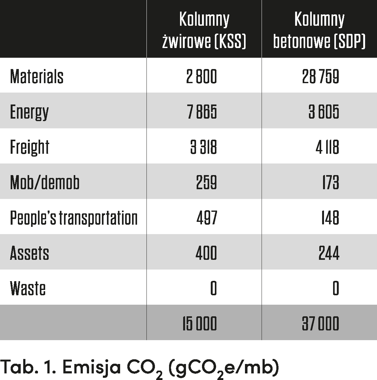 Aby utrudnić zadanie, założymy różne rozstawy kolumn. W przypadku elementów betonowych kolumny będą w rozstawie 2,0 m, a elementy żwirowe 1,6 m (sumarycznie kolumn żwirowych więcej o 56 proc.). Do wykonania kolumn betonowych przyjmiemy beton klasy C30/37 S4 na cemencie CEM III/A. W przypadku posadowienia nasypów na gruntach słabonośnych skrajne rzędy kolumn się zbroi, a w przypadku niedostatecznej sztywności materaca może zaistnieć konieczność zbrojenia wszystkich kolumn. Realizując wzmocnienie pod posadzką, część z kolumn będzie zbrojona ze względu na ich nierównomierne odkopanie w trakcie wykonania instalacji podsadzkowych. Mając na uwadze powyższe, w niniejszym przykładzie zakładamy 25-proc. udział elementów zbrojonych. Z porównania obu rodzajów wzmocnienia gruntu wynika, że w przypadku wzmocnienia za pomocą kolumn żwirowych emisja gazów cieplarnianych jest o 38 proc. niższa niż porównywalne wzmocnienie za pomocą kolumn betonowych. W przypadku 1 mb różnica jest jeszcze większa, bo wynosi aż 60 proc.