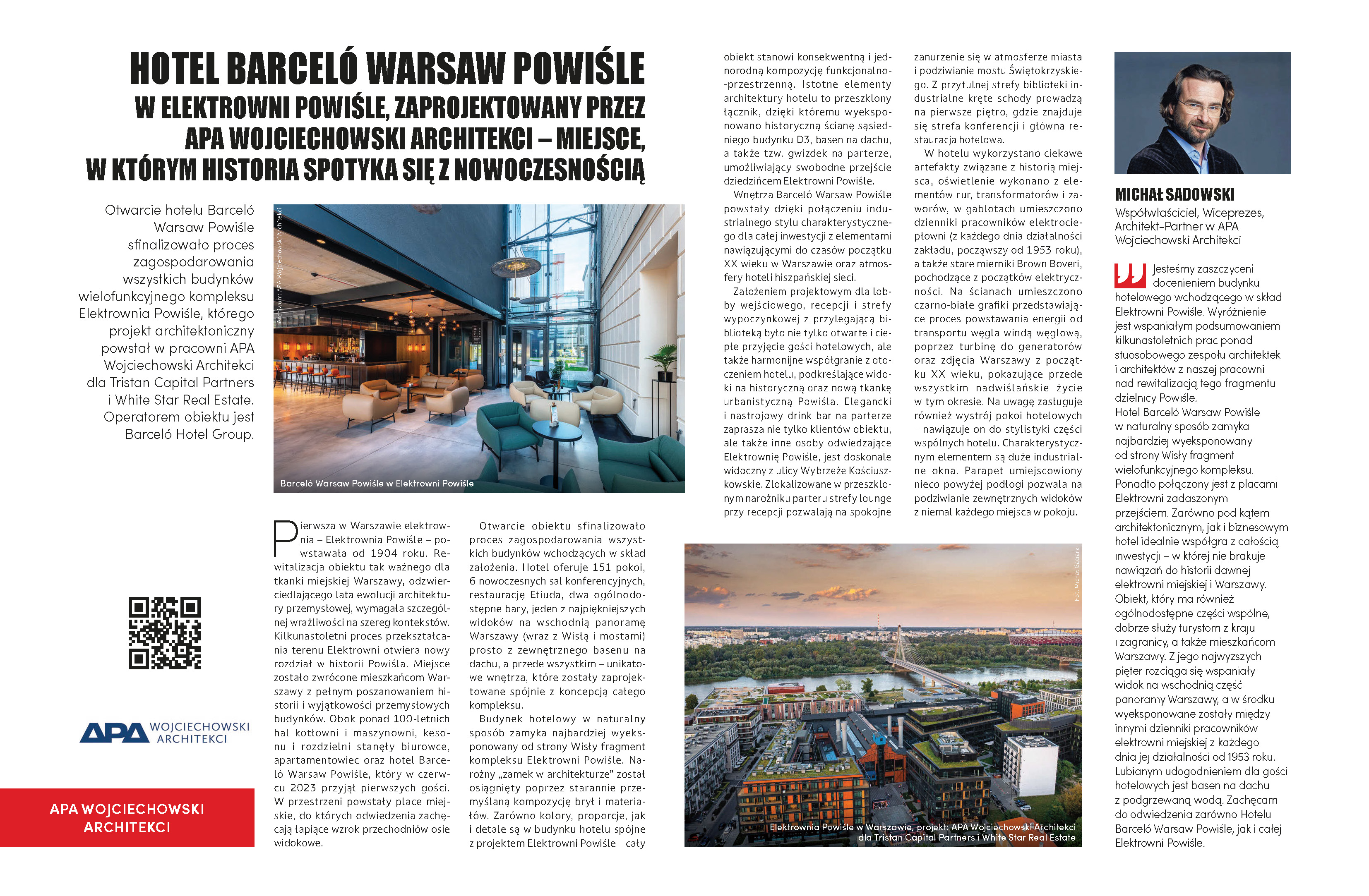 Otwarcie hotelu Barceló Warsaw Powiśle sfinalizowało proces zagospodarowania wszystkich budynków wielofunkcyjnego kompleksu Elektrownia Powiśle, którego projekt architektoniczny powstał w pracowni APA Wojciechowski Architekci dla Tristan Capital Partners i White Star Real Estate. Operatorem obiektu jest Barceló Hotel Group.