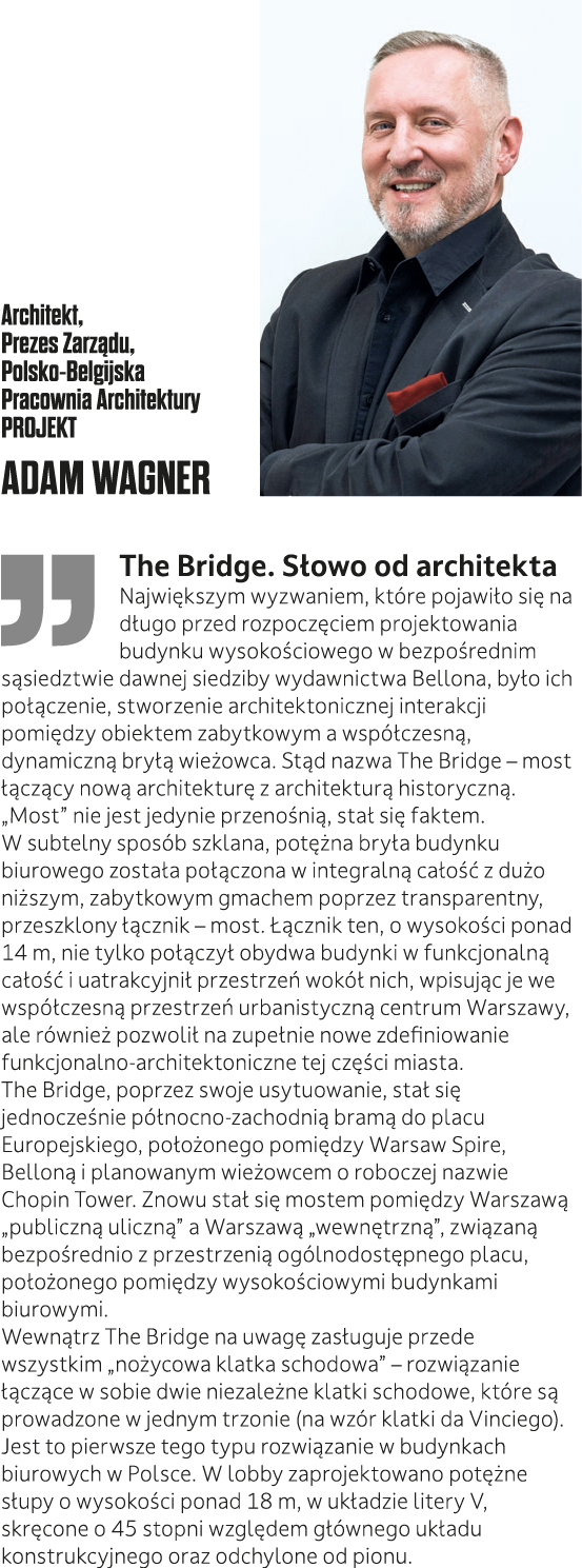 – The Bridge, dosłownie i w przenośni, stanowić będzie most między industrialną przeszłością Woli a jej nowym, wielkomiejskim obliczem, które wyraża się w architekturze szklanych wieżowców. To projekt wyjątkowy z wielu względów, ale jednym z nich jest to, że odnajdą się w nim zarówno firmy szukające dla siebie nowoczesnego, dynamicznego środowiska pracy, jak i miłośnicy starych murów i kameralnej skali. W tej jednej inwestycji łączymy ze sobą dwa różne światy, które dzięki synergii stworzą niepowtarzalne miejsce na biurowej mapie Warszawy – mówi Jarosław Zagórski, Dyrektor Zarządzający Ghelamco Poland.