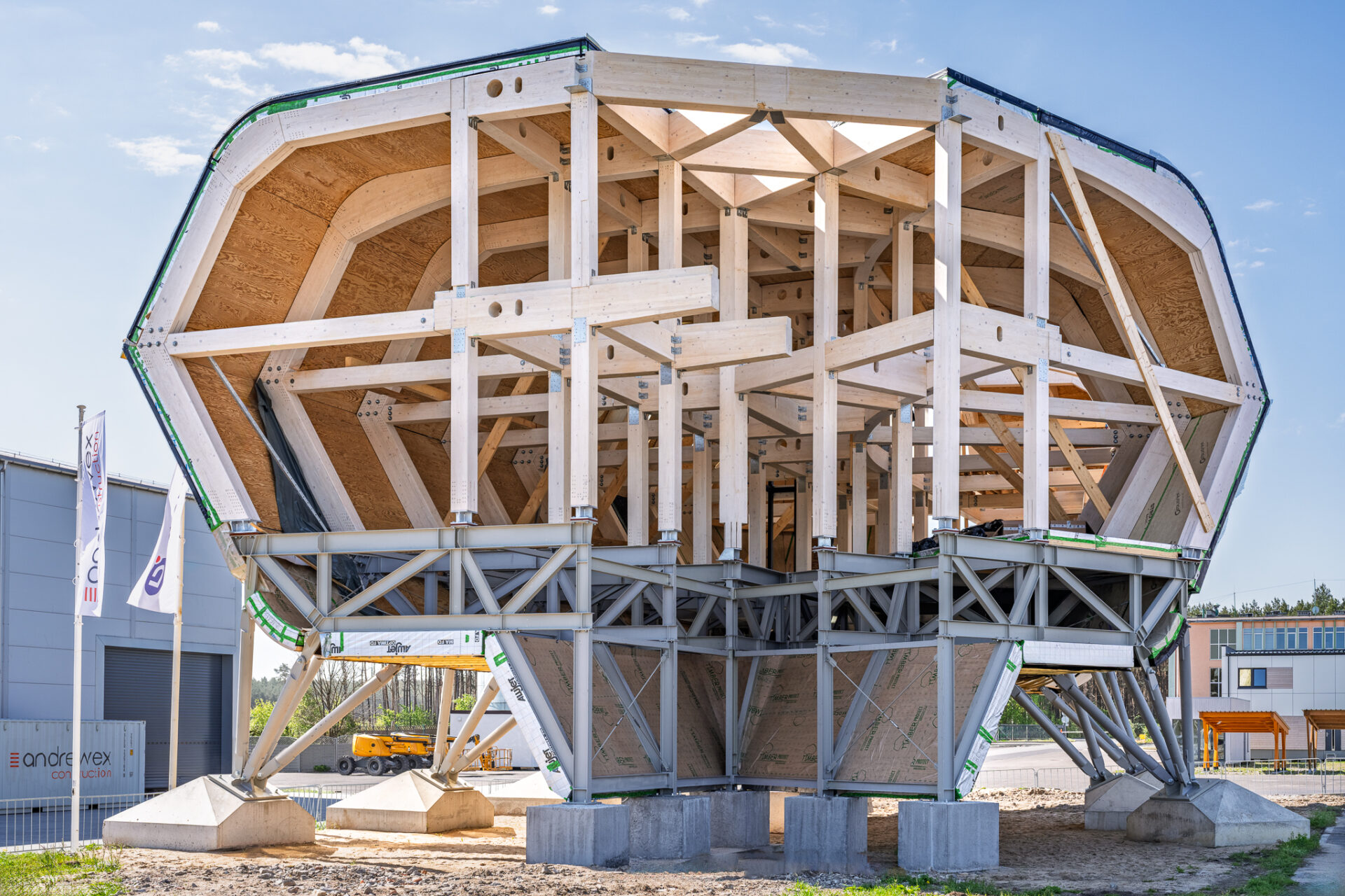 Montaż próbny został wykonany na terenie zakładów produkcyjnych firmy Andrewex Construction w Cierpicach pod Toruniem. Polegał na tymczasowym wzniesieniu blisko 1/3 budynku głównego i umożliwił weryfikację poprawności konstrukcji oraz potwierdzenie zgodności przyjętej technologii z założeniami projektowymi. Pozwolił również na zidentyfikowanie ewentualnych ryzyk, które mogłyby wpłynąć na ciągłość prac.