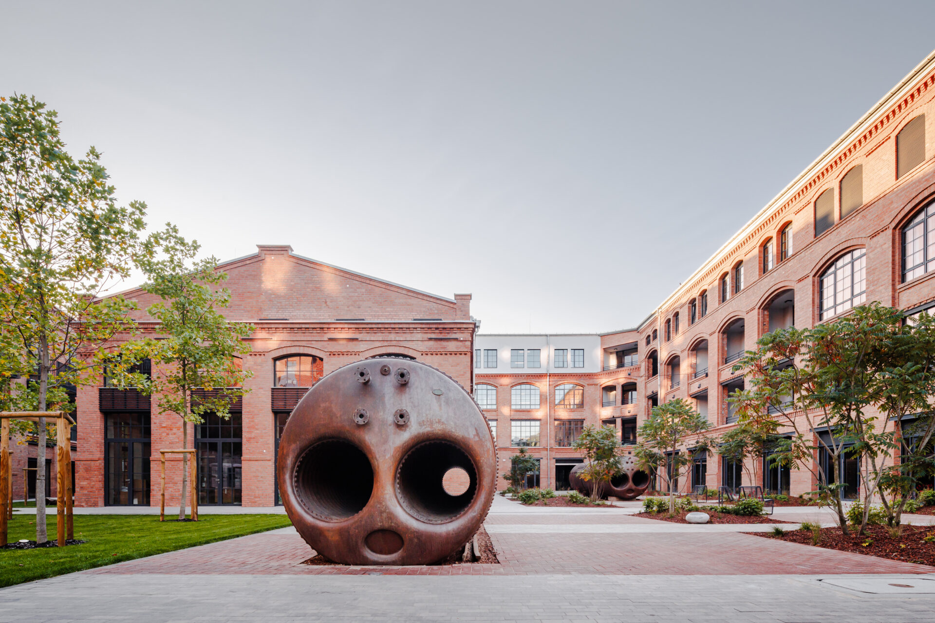 Budynki jako takie, będąc zabytkami rejestrowymi, siłą rzeczy musiały pozostać uzupełnione w miejscach ubytków lub wadliwych technicznie elementów zgodnie ze sztuką konserwatorską. Z detali zaś, które się nam zachowały, postanowiliśmy wyeksponować zarówno te o niewątpliwej wartości historycznej lub tożsamościowej dla terenu fabryki, jak i te będące po prostu stąd i niosące w sobie ducha tego miejsca. Widoczne w wielu ogólnodostępnych fragmentach pasażu, w całości i fragmentach kotły parowe czy też widoczne w przestrzeniach wspólnych historyczne balustrady schodowe, stalowe wrota fabryczne lub fragmenty najstarszych mozaik podłogowych to wartościowe historyczne artefakty. Inną zaś grupę stanowią stare kraty okienne, odkryte pod dziedzińcem szyny kolejki wąskotorowej lub stalowe ramy wiszącego kiedyś między budynkami łącznika technicznego użyte przez nas w formie przegród, barier lub ozdób podkreślających metamorfozę i postindustrialny charakter tego miejsca.