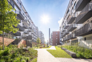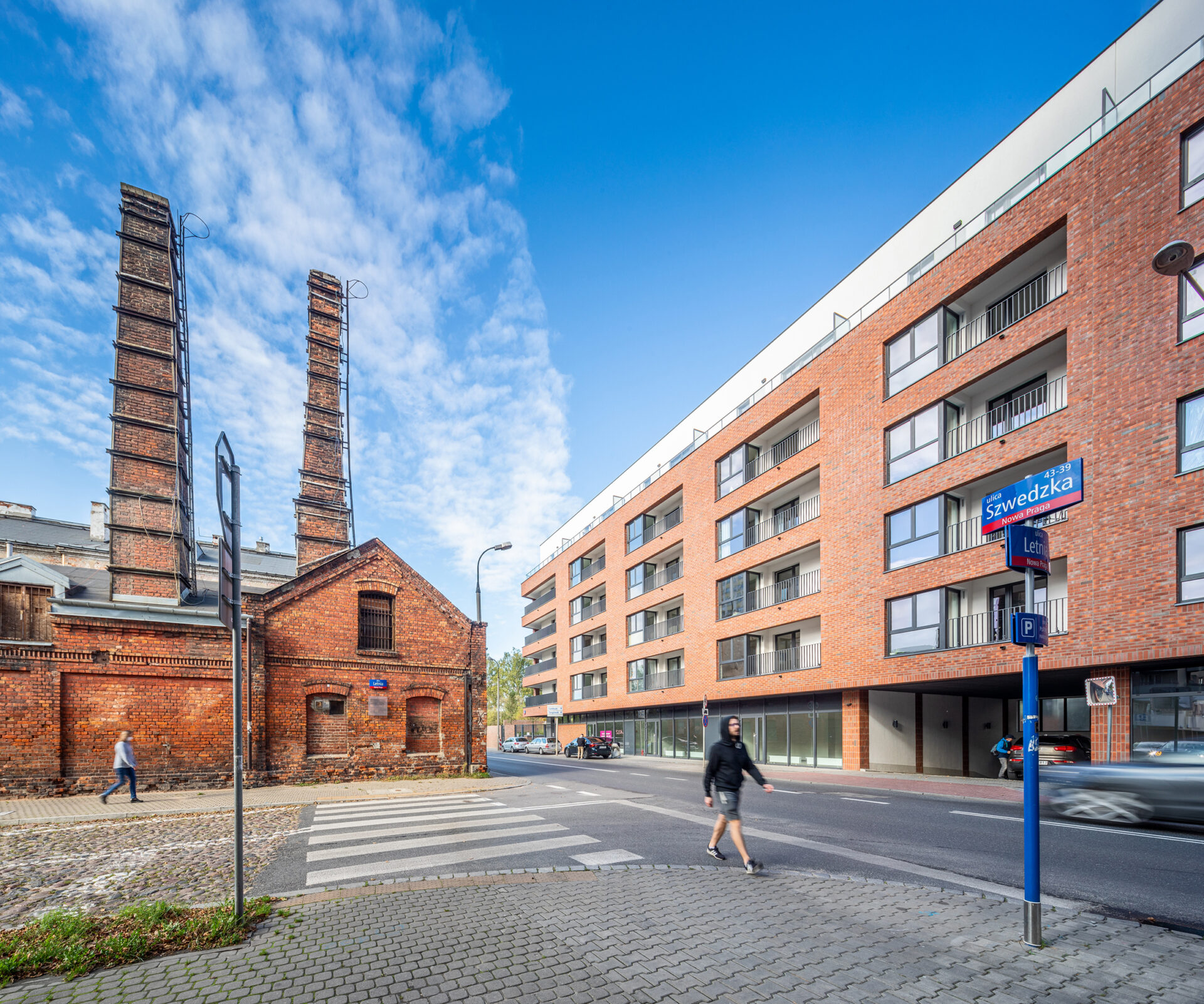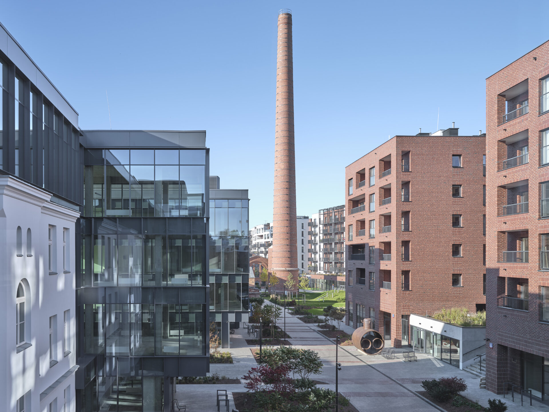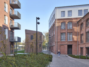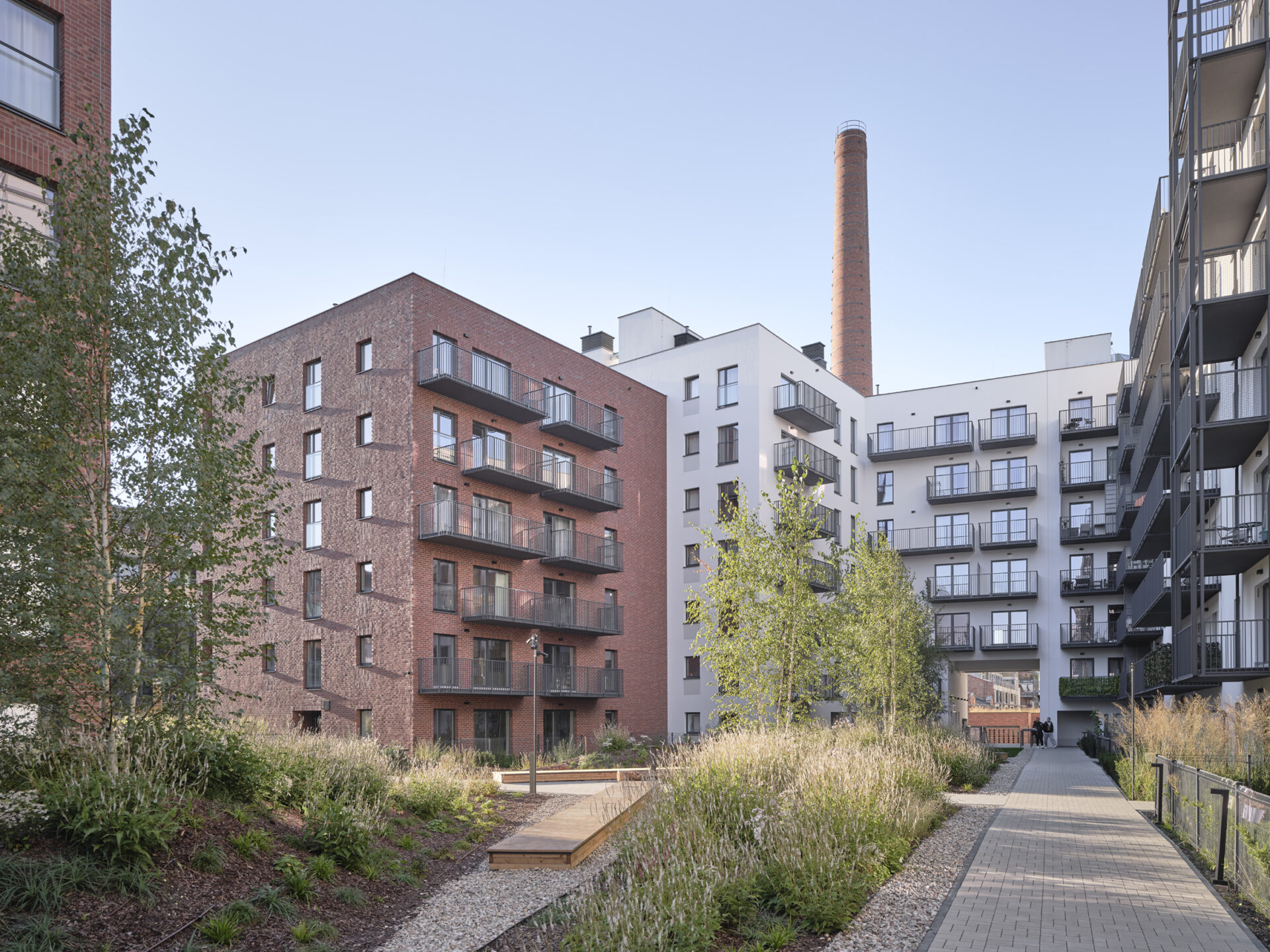 Kompozycja współczesnych budynków, które zaprojektowaliśmy w miejscu – wyburzonych i niemających wartości zabytkowej – obiektów powstałej tu po wojnie Fabryki Kosmetyków „Pollena”, podkreśliła historyczny układ pierwotnej, industrialnej zabudowy oraz nawiązała skalą do otaczających inwestycje praskich kamienic. Całość założenia spięta jest dwiema osiami rekreacyjnymi, które w centrum kompleksu obok fabrycznego komina przenikają się nawzajem. To tu biegnącą przez dziedzińce mieszkaniowe rekreacyjną oś osiedla, mającą charakter przeznaczonego dla mieszkańców parku liniowego, harmonijnie połączyliśmy z ogólnodostępnym pasażem z usługami zaprojektowanymi w parterach zabudowy – zarówno historycznej, jak i uzupełniającej, zakomponowanym równolegle do ulicy Szwedzkiej. Oba te ciągi piesze niczym yin i yang przeplatają się równolegle pomiędzy budynkami.