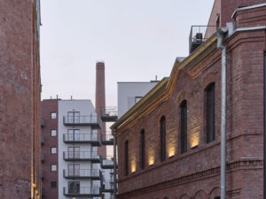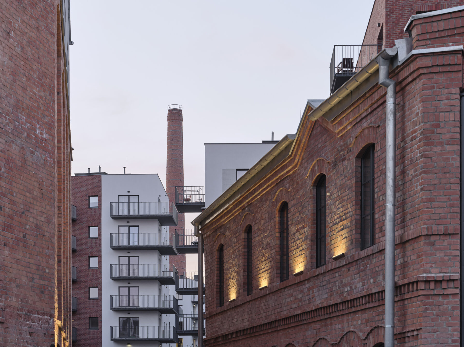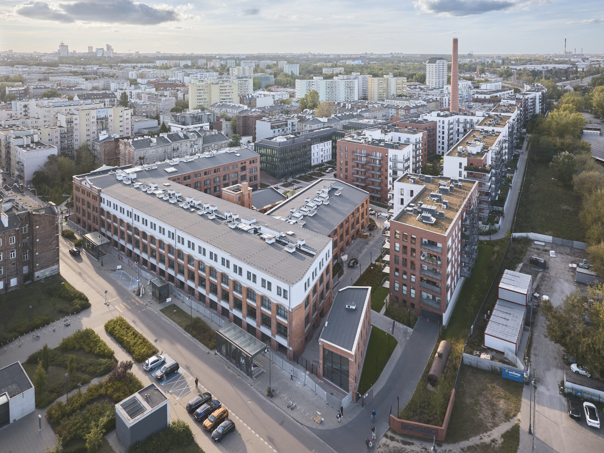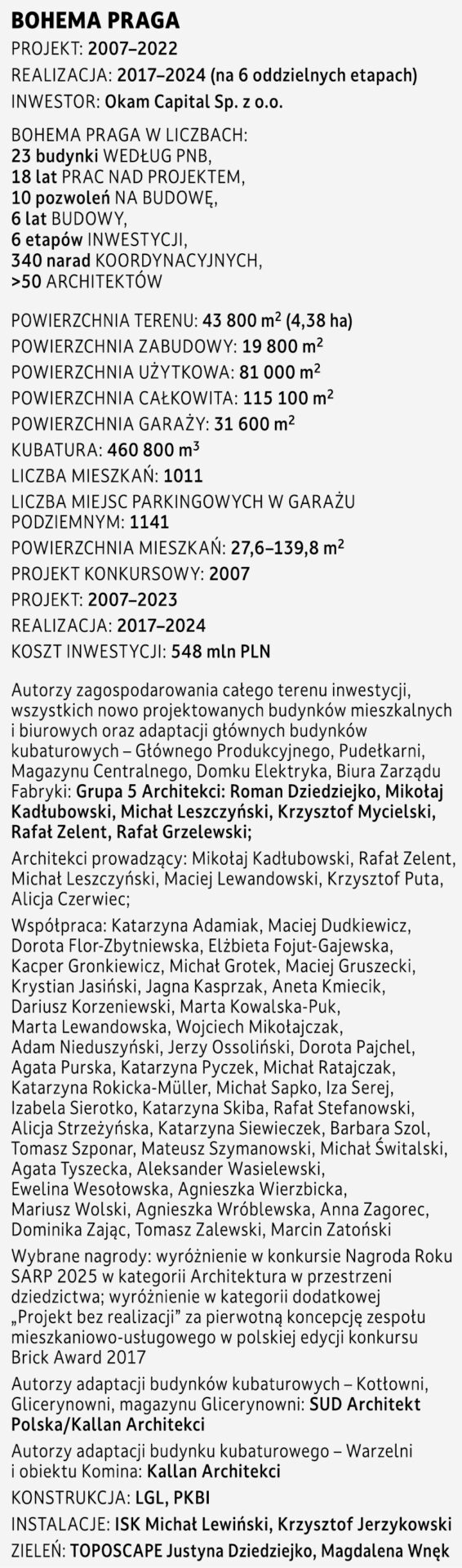 Niezależnie od faktu, iż zrewitalizowany kompleks składa się w większości ze współczesnej zabudowy, od początku projektowania przyświecała nam idea, iż wszyscy, którzy tu pracują, mieszkają lub są tylko czasowymi użytkownikami, powinni odczuwać, że przebywają na terenie dawnej fabryki. Zarówno nowe, jak i stare budynki, na zewnątrz i wewnątrz, mają surowy, postindustrialny oraz nieco siermiężny charakter wyrażony w formie, materiale i detalu nawiązujących do substancji zastanej. Zależało nam bardzo, aby nowa architektura nawiązywała do poprzemysłowego dziedzictwa, a przy tym wpasowywała się skalą w gabaryt historycznego otoczenia. Detalem i stylistyką ma podkreślać charakter miejsca i jednocześnie stanowić tło dla zabytkowych budynków fabryki. Tworząc detale i dobierając materiały wykończeniowe zarówno przestrzeni wspólnych, jak i elewacji, zawsze przyświecała nam myśl, że to ma być osiedle/zespół zabudowy z jasną, czytelną i charakterystyczną konotacją –to jest teren starej fabryki, pracujesz,mieszkasz czy odwiedzasz zrewitalizowaną przestrzeń o konkretnym wyrazie, a nie kolejne warszawskie osiedlemieszkaniowe bez odniesienia do kontekstu. To jest pofabryczny teren nastarej Pradze.