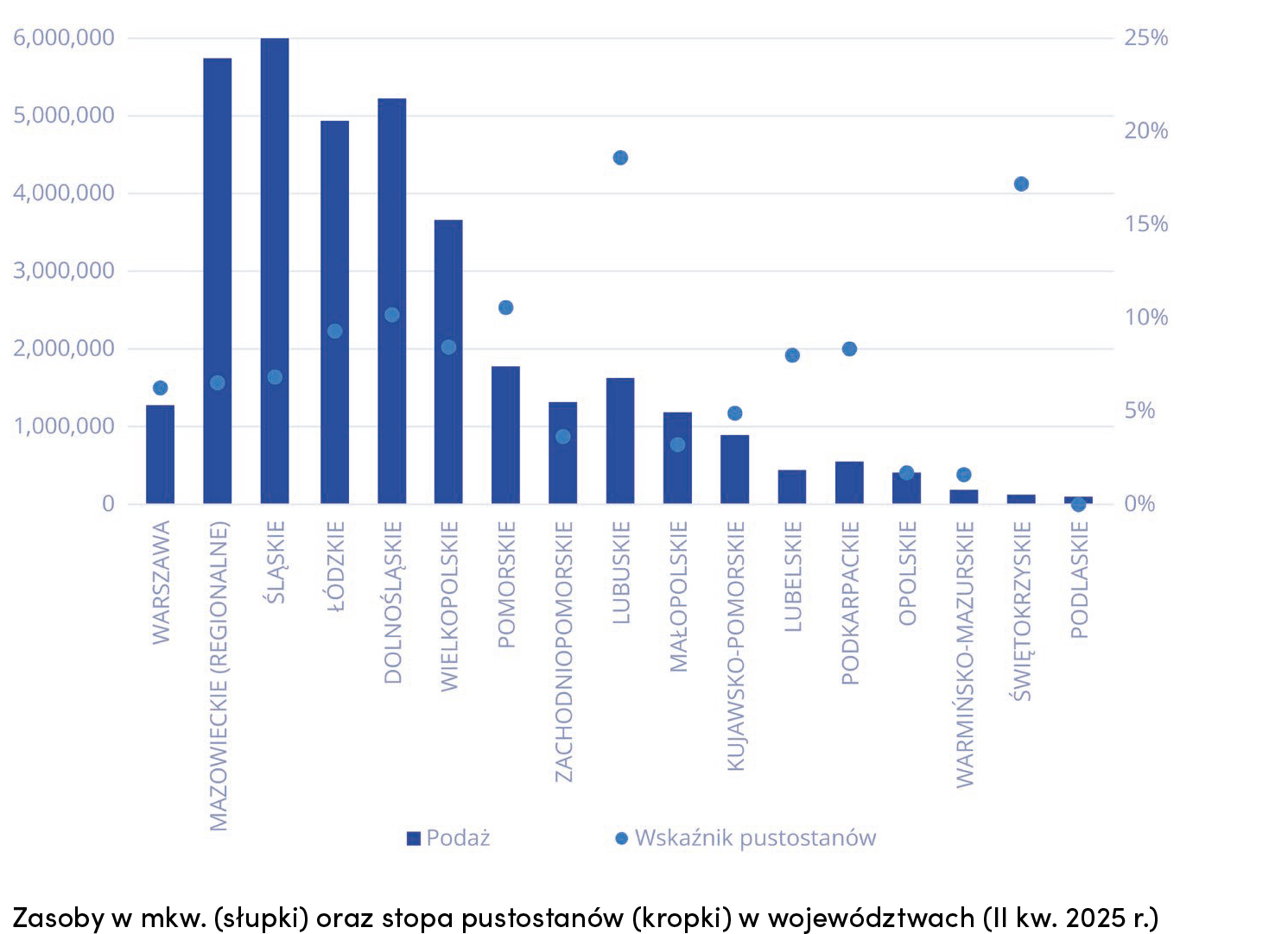 Mimo dużej skali podaży relatywnie niski poziom pustostanów (6,5 proc.) utrzymuje województwo mazowieckie, co świadczy o silnym popycie i stabilności lokalnego rynku. Zaś najniższe wskaźniki pustostanów odnotowano w Małopolsce (3,2 proc.) i w województwie zachodniopomorskim (3,6 proc.).
