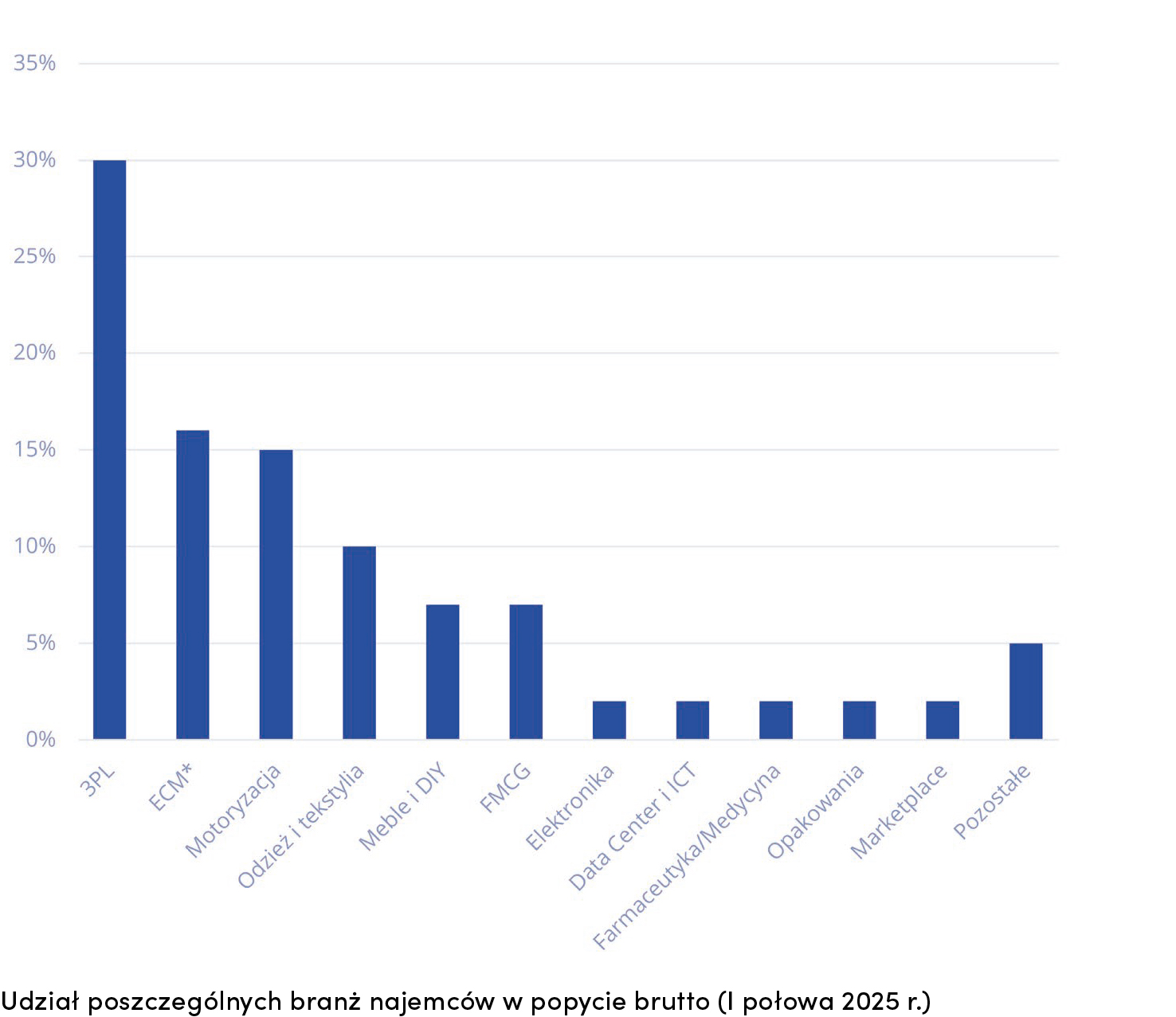 Z kolei w ujęciu branżowym największy udział utrzymali operatorzy logistyczni (30 proc.), jednak istotną rolę odegrały także sektory inżynieryjny, budowlany i maszynowy (16 proc.), motoryzacyjny (15 proc.), odzieżowy (10 proc.) oraz meblarski i DIY (7 proc.). Taka dywersyfikacja wskazuje na rosnącą uniwersalność polskiego rynku magazynowego i jego zdolność do obsługi złożonych łańcuchów dostaw.