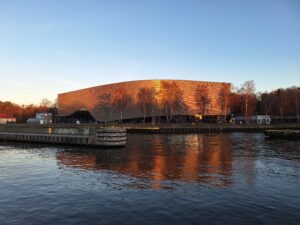 Frontowa fasada to swoisty „rzeźbiarski ekran”, który od początku miał łączyć w sobie artystyczną ekspresję i technologiczną precyzję. Uformowana jako powierzchnia dwukrzywiznowa została wykonana z modrzewia syberyjskiego i oparta na złożonej, stalowo-drewnianej konstrukcji nośnej. Jej długość – blisko 90 m – i trzymetrowe nadwieszenie nad terenem sprawiają, że bryła zdaje się lewitować nad nabrzeżem, jednocześnie zachowując płynność i lekkość formy.